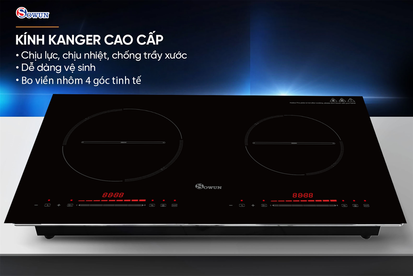 Bếp từ đôi Sowun SW 1222 được thiết kế  với mặt kính đen nguyên khối, viền kính được bo bằng kim loại tạo màu sắc tinh tế sắc nét, cùng nhiều tiện ích sử dụng đặc biệt 100% linh kiện được nhập khẩu với độ bền cao, siêu tiết kiệm điện năng, tiện lợi, đa năng có thể dùng trong gia đình, nhà hàng, tiệc cưới, hoặc bất cứ nơi nào phục vụ nấu nướng