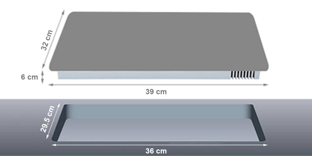 - Kích thước, khối lượng: Ngang 32 cm – Dọc 39 cm – Cao 7.7 cm – Nặng 4 kg - Kích thước lỗ đá: Ngang 36 cm – Dọc 29.5 cm Công suất bếp: