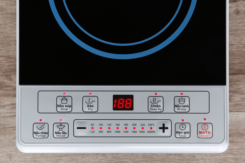 Mặt kính ceramic chịu nhiệt Mâm từ đường kính 22cm Mâm từ tự động nhận biết kích cỡ xoong nồi. Chức năng hẹn giời, chế độ xào rá Điều khiển công suất / nhiệt độ