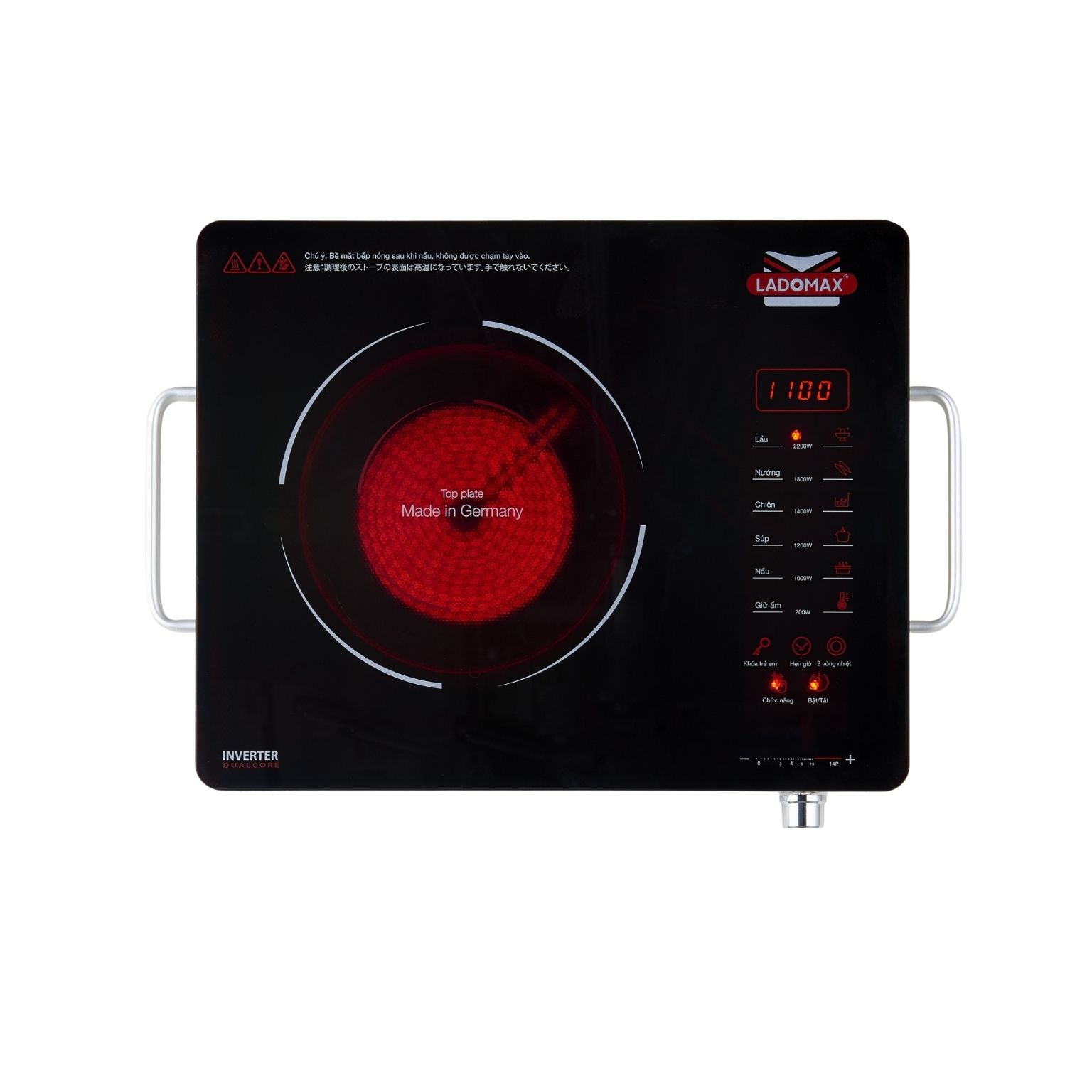 Mô Tả Sản Phẩm CÔNG SUẤT CỰC MẠNH 2200W, ĐIỀU CHỈNH NHIỆT ĐỘ BẰNG CẢM ỨNG VÀ NÚM XOAY, KHÔNG KÉN NỒI,DÙNG CHO MỌI LOẠI NỒI,CÓ THỂ NƯỚNG TRỰC TIẾP LÊN BẾP MẶT KÍNH GERMANY