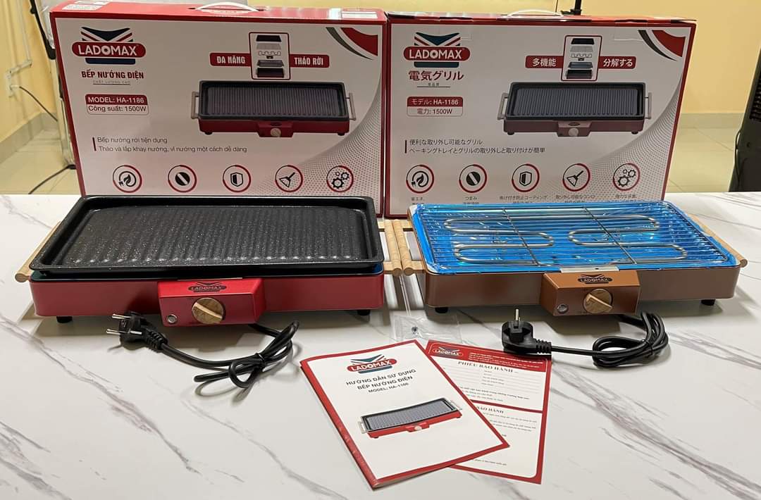 - Tên sản phẩm: BẾP NƯỚNG ĐIỆN ĐA NĂNG - Thương hiệu: LADOMAX - Model: HA-1186 - Điện áp: 220V - 50Hz - Công suất: 1500W - Cáu tạo :rời - Chất liệu Khay nướng:Nhôm