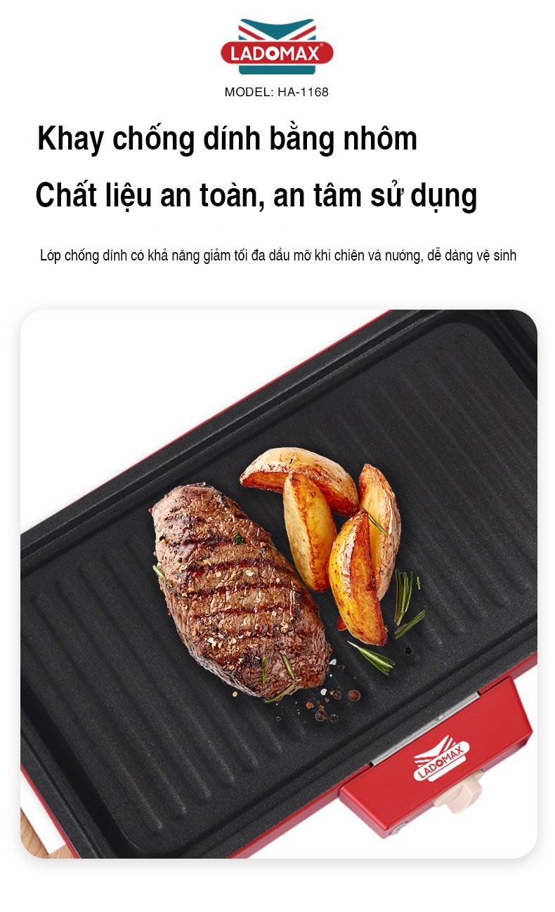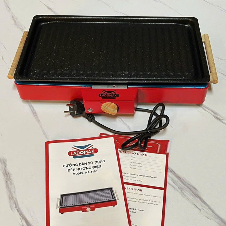 Tên sản phẩm: Bếp nướng điện đa năng Thương hiệu: Ladomax Model: HA-1186 Điện áp: 220V-50Hz Công suất: 1500W Cấu tạo: rời Chất liệu khay nướng: Nhôm Chất liệu vỉ nướng: Inox Khay hứng