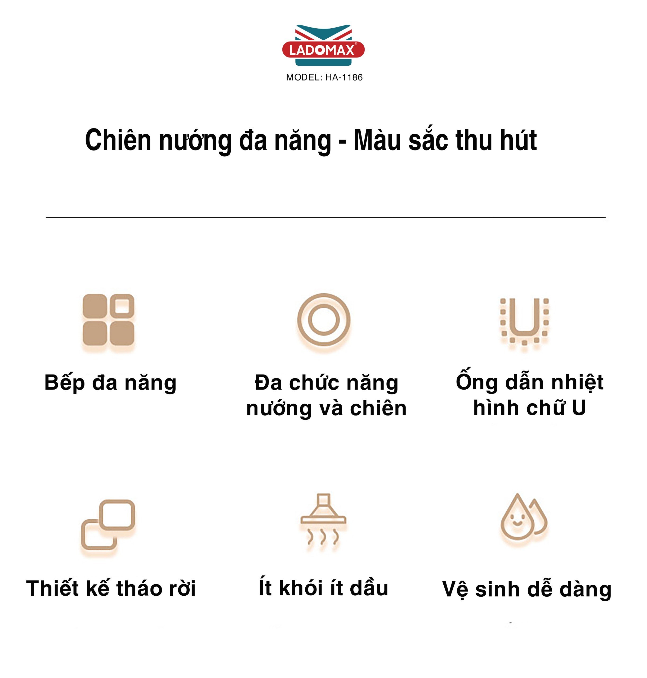 - Tên sản phẩm: BẾP NƯỚNG ĐIỆN ĐA NĂNG - Thương hiệu: LADOMAX - Model: HA-1186 - Điện áp: 220V - 50Hz - Công suất: 1500W - Cáu tạo :rời - Chất liệu Khay nướng:Nhôm