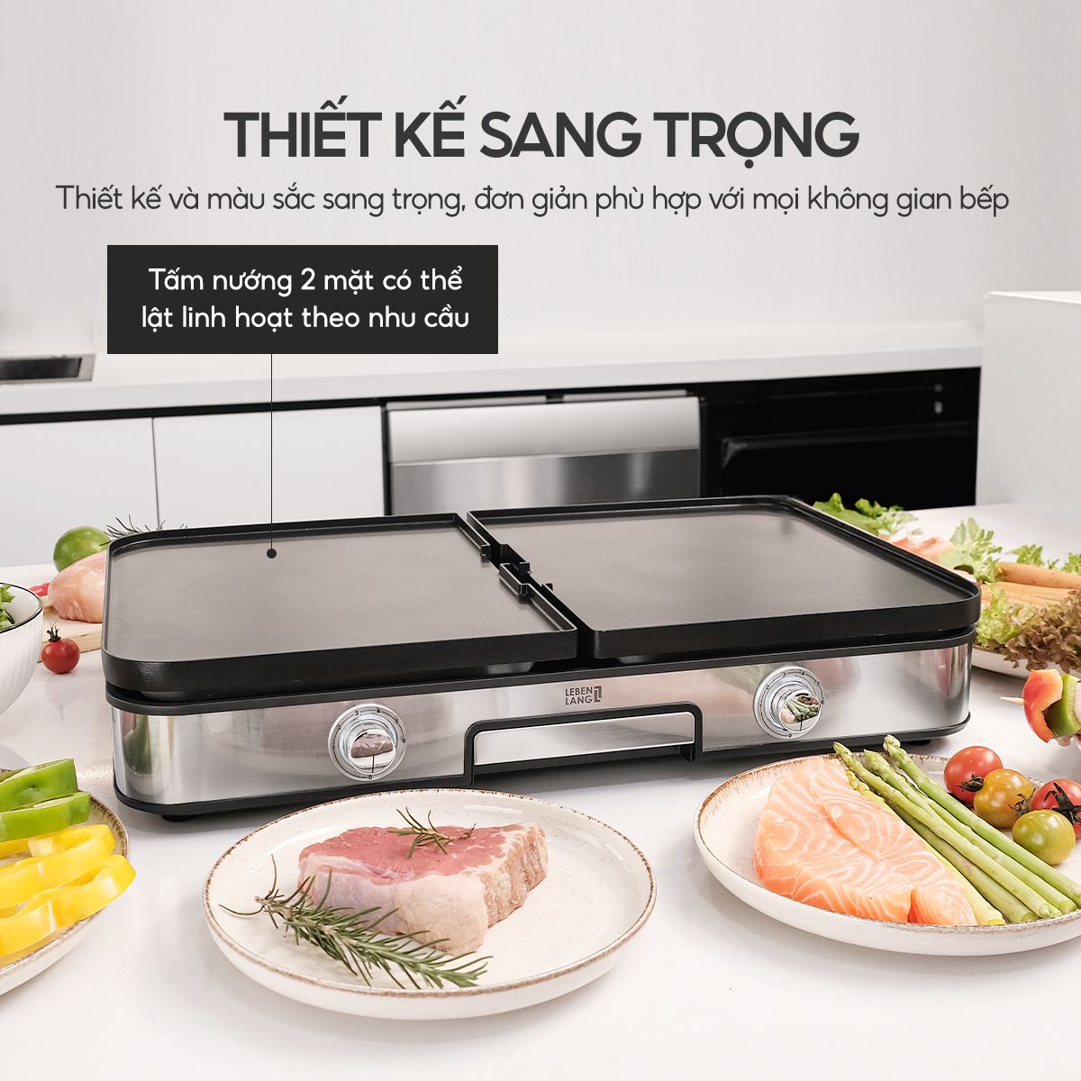 Bếp nướng điện không khói Lebenlang LBL8586, khay nướng tháo rời, chống dính cao cấp, công suất 2000W, bảo hành 2 năm - hàng chính hãng   10 LÝ DO NÊN CHỌN BẾP NƯỚNG LBL8586 CỦA LEBENLANG - Công suất mạnh mẽ lên đến 2000W - Kích thước bếp rộng rãi cho 6-8 người  - 6 mức nhiệt độ linh hoạt và 2 bộ điều chỉnh nhiệt tách riêng biệt - Có lỗ thoát dầu và khay đựng dầu thừa giúp loại bỏ dầu thừa  - Lớp chống dính cao cấp không chứa PFOA và thanh chắn dầu bằng inox - Khe tản nhiệt giúp hạn chế tình trạng quá nóng và bảo vệ bếp nướng - Có thanh chắn dầu bằng inox giúp hạn chế dầu thừa và dễ dàng vệ sinh - Thiết kế sang trọng, màu sắc trang nhã - Dễ dàng vệ sinh và tháo lắp, có thể sử dụng trong máy rửa bát, tiết kiệm thời gian và công sức  - Bảo hành chính hãng 2 năm     I. THÔNG SỐ KỸ THUẬT  - Thương hiệu: Lebenlang - Model: LBL8586 - Công suất: 2000W - Kích thước tổng: 48 x 32 x 14 cm - Kích thước 1 tấm nướng: 24 x 32 cm - Cân nặng: 3,7kg - Có 2 tấm nướng, 2 thanh chắn - Khay hứng dầu - 6 mức điều chỉnh nhiệt II. ĐẶC ĐIỂM NỔI BẬT -  Bếp nướng điện không khói Lebenlang LBL8586 - Sự lựa chọn hoàn hảo cho mỗi bữa ăn của gia đình bạn   -  Với công suất mạnh mẽ lên đến 2000W, bạn có thể chế biến các món nướng đậm đà hương vị một cách nhanh chóng và dễ dàng.   -  Phục vụ cho các buổi tụ tập gia đình, bữa tiệc cuối tuần với bạn bè, hoặc những dịp lễ quan trọng, bếp nướng điện Lebenlang đảm bảo sẽ là trợ thủ đắc lực của bạn.   -  Kích thước bếp rộng rãi: 48 x 32 x 14 cm, phục vụ cho 6-8 người một cách dễ dàng.   -  Bếp nướng không khói LBL8586 với 6 mức nhiệt độ linh hoạt và 2 bộ điều chỉnh nhiệt tách riêng biệt, bạn có thể dễ dàng điều chỉnh nhiệt độ phù hợp với mọi loại thực phẩm.