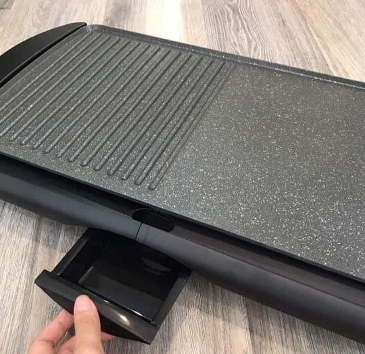 Bề mặt vỉ nướng có lỗ thoát dầu và bên dưới vỉ có ngăn hứng dầu, giúp dễ dàng loại bỏ dầu mỡ thừa khi đang nướng. Đồng thời, vỉ nướng được đính kèm theo giá đỡ, giúp nâng một bên vỉ nướng (bên cắm bộ điều nhiệt) cao hơn bên còn lại (bên có lỗ thoát dầu) để dầu mỡ có thể dễ dàng chảy về phía lỗ thoát dầu, vừa mang lại món ăn ngon, vừa đảm bảo an toàn sức khỏe cho bạn và những người thân trong gia đình.