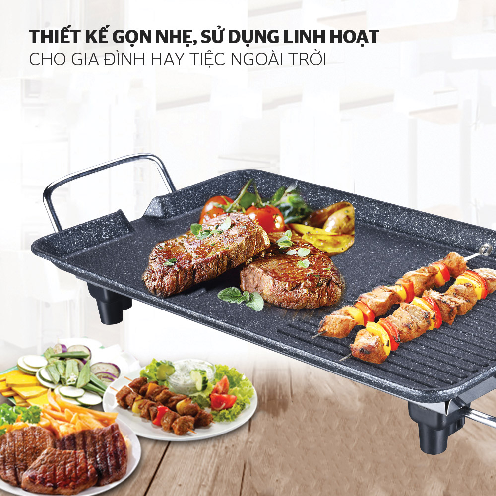 Mặt bếp được làm từ nhôm cao cấp, kích thước rộng rãi, dễ dàng đáp ứng nhu cầu sử dụng thực phẩm cho bữa tiệc đông người. Trên bề mặt bếp được phủ 2 lớp chống dính siêu bền, làm giả đá rất đẹp và bắt mắt.