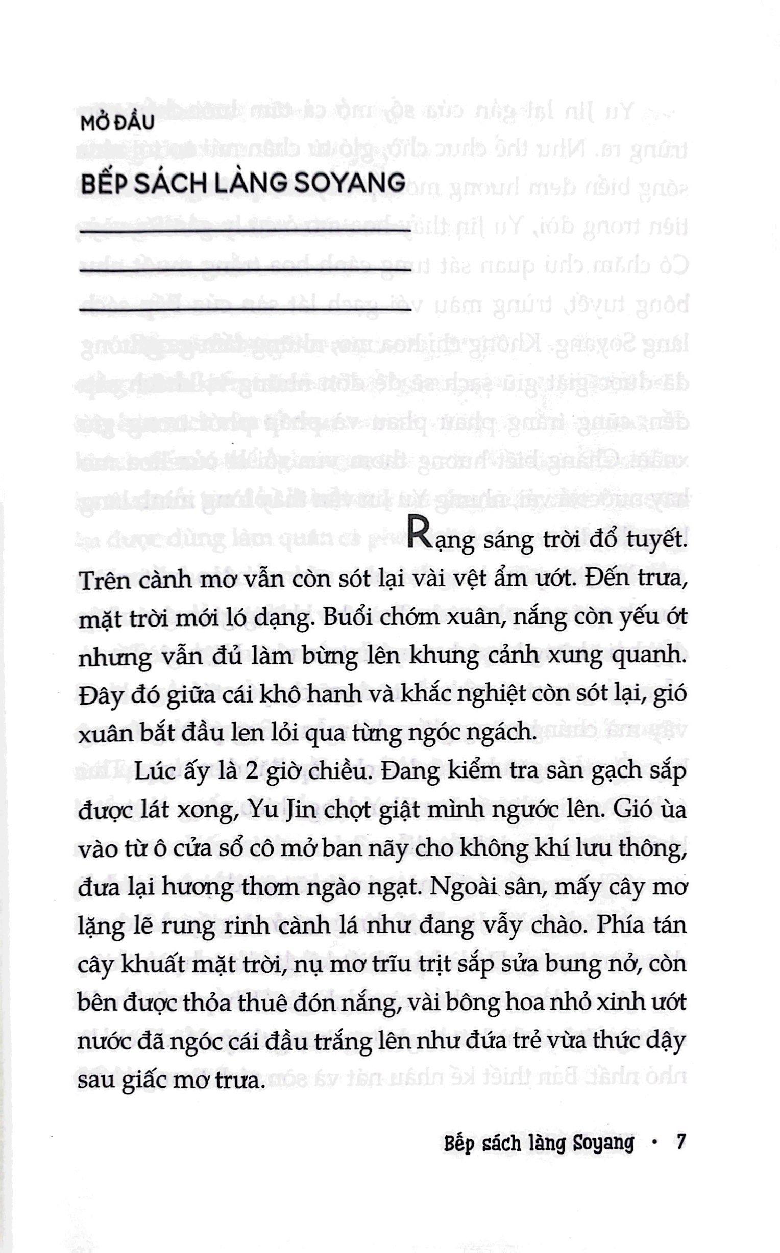 Chớm xuân. Nắng tinh khôi, nụ mơ trĩu trịt chờ bung nở, gió sớm ngào ngạt ngát hương: Bếp sách làng Soyang bắt đầu mở cửa.