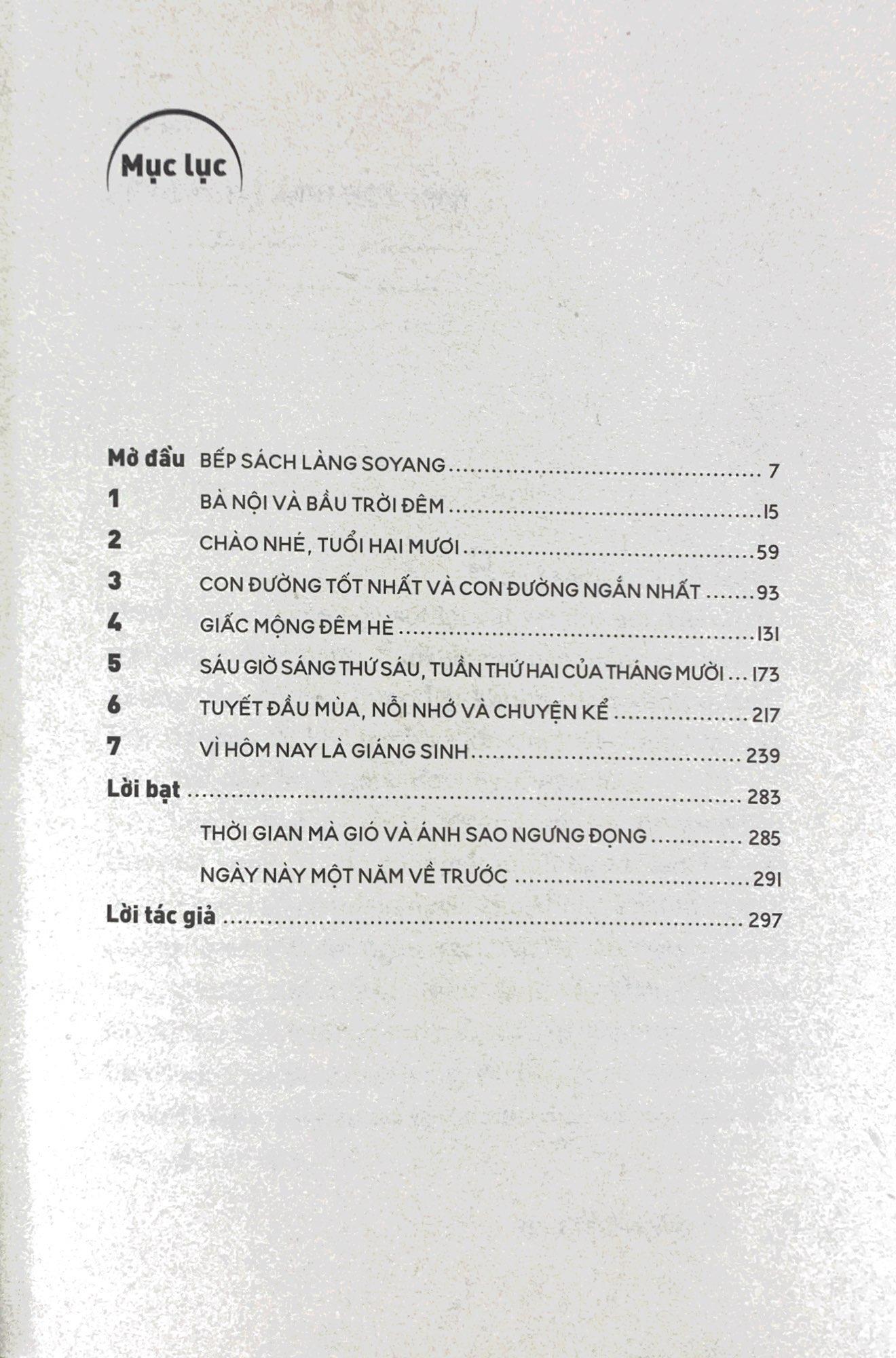Xuân qua hè đến. Thu sang đông tới. Bằng giọng văn chân thành mộc mạc, cùng cách miêu tả nên thơ, gợi hình gợi cảm, Bếp sách làng Soyang lần lượt mang tới cho chúng ta những mảnh đời, những câu chuyện khác nhau. Khách đến đây, dừng chân, suy ngẫm, nhìn lại và rồi một lần nữa tiếp tục hành trình cuộc đời.