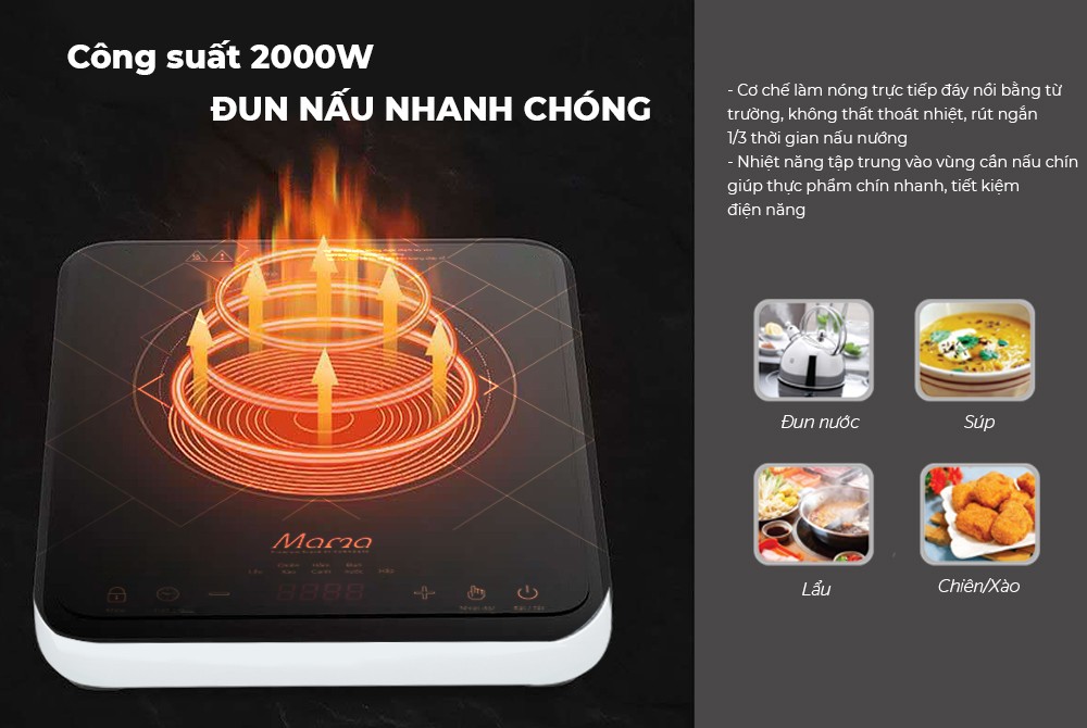 Bếp từ đơn SUNHOUSE MAMA SHD6860 có công suất cao 2000W giúp quá trình gia nhiệt diễn ra nhanh hơn. Cơ chế làm nóng trực tiếp đáy nồi bằng từ trường và nhiệt năng chỉ tập trung vào vùng cần nấu chín giúp thực phẩm chín nhanh, rút ngắn thời gian nấu nướng.
