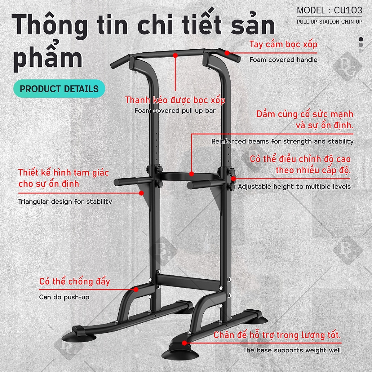 ----- Công nghệ sản xuất theo quy trình & thiết kế chặt chẽ.Ngoài sự chắc chắn thiết kế tăng cường thêm 4 thanh chống lật vì thế tải trọng tối đa không chỉ chịu lực 100kg mà có thể đạt 150kg. Hoàn toàn có thể bỏ qua việc so sánh chiều cao của mình trước khi mua bộ xà đơn, xà kép đa năng cao cấp này. Vì nó loại bỏ mọi ranh giới về chiều cao nhờ việc cho phép điều chỉnh chiều cao dễ dàng với 4 mức cân chỉnh & đương nhiên tính năng này phù hợp với cả gia đình bạn - mặc dù đó là trẻ em.