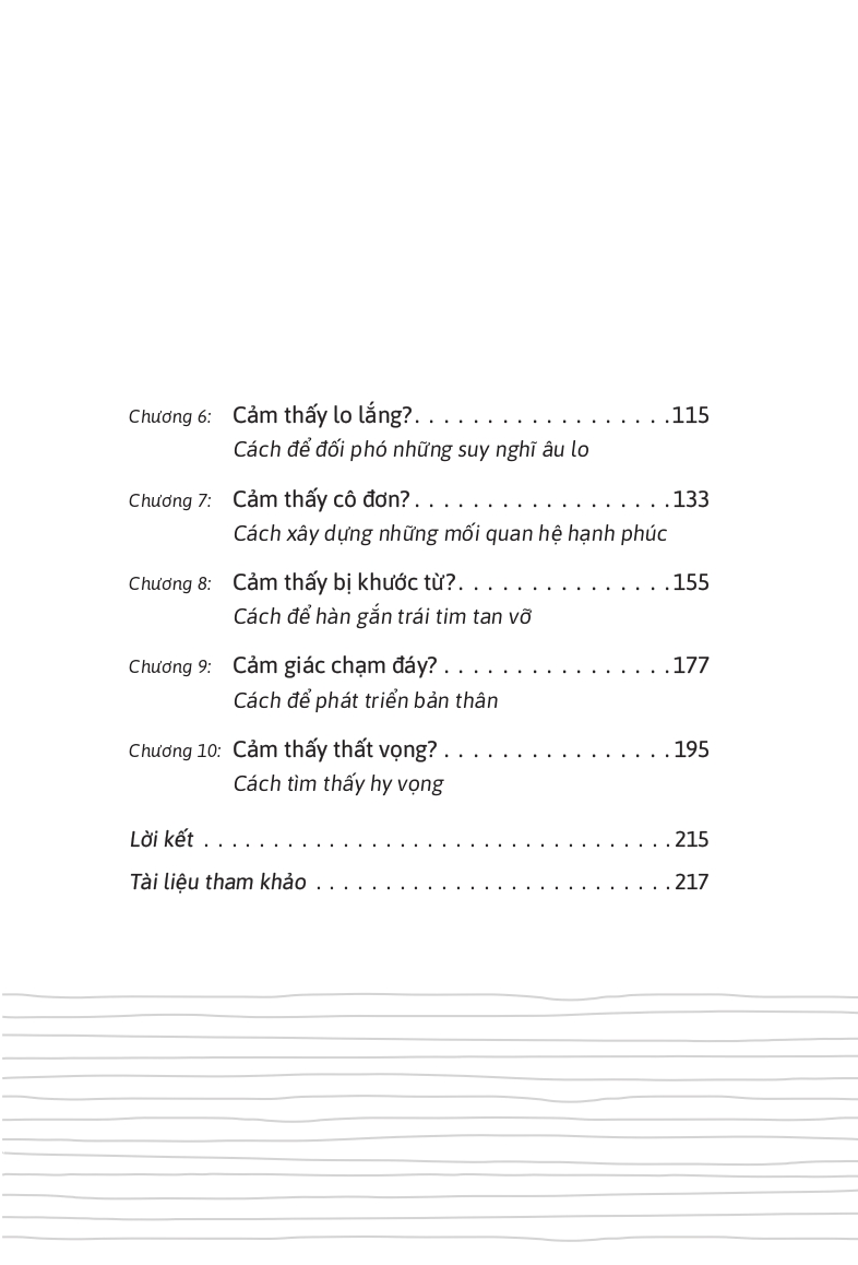 Phần 3: Đối phó thế nào? Phần này sẽ mang đến các chiến lược dài hạn để chuyển hóa một cảm xúc hay tâm trạng tiêu cực nào đó. Quyển sách sẽ giới thiệu với các bạn các kế hoạch phát triển nội tại để xây dựng sức bật, khả năng tự phục hồi cũng như khả năng đương đầu với khó khăn.