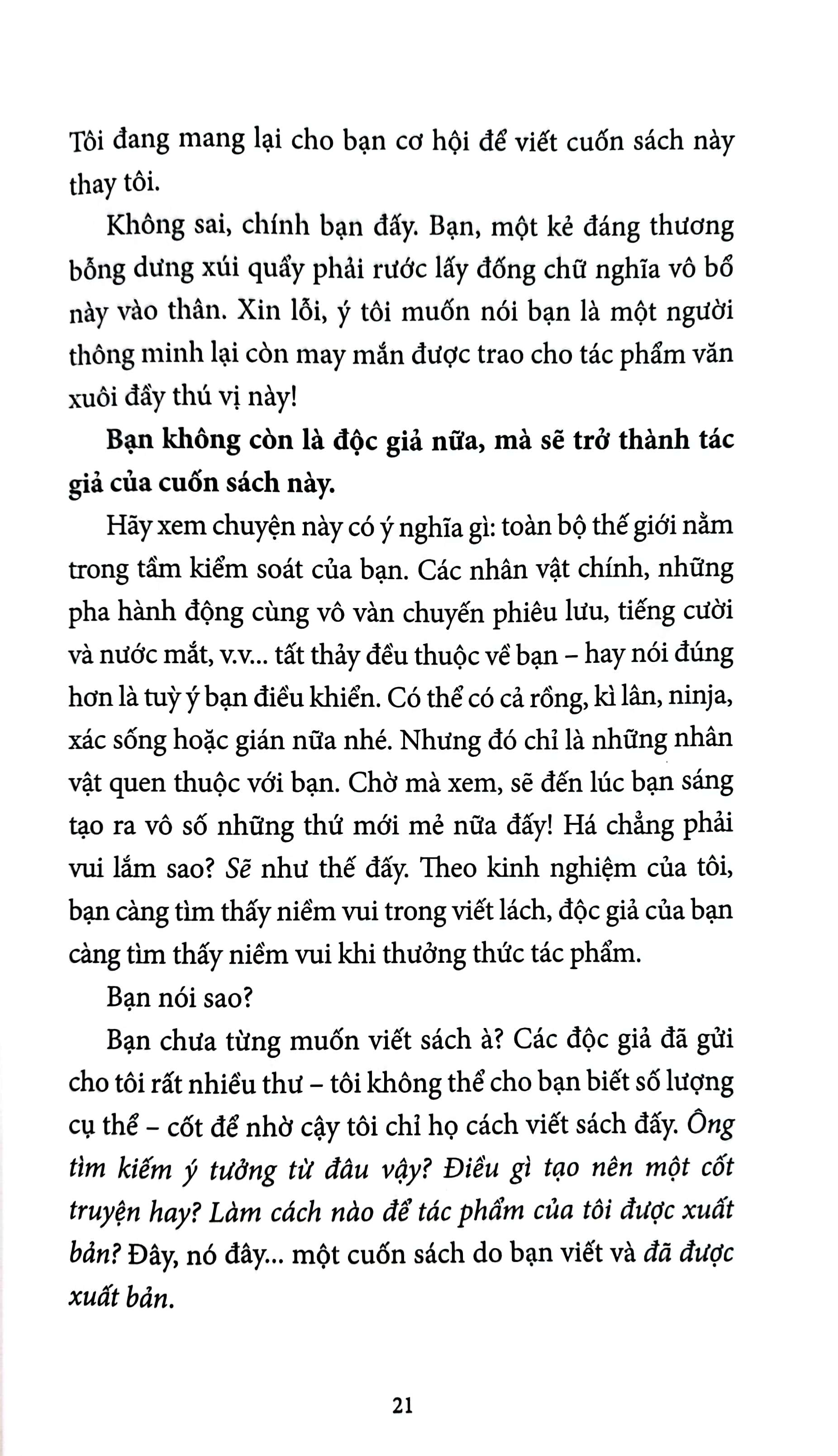 Cuốn sách này cần sự giúp đỡ của bạn. Vâng, chính bạn đấy. Bạn có thể sáng tác mà, phải không? Ôi, tuyệt! Tác giả của cuốn sách này hiện đang mất tích. Hừm, cũng không hẳn vậy. Một tác giả mà tôi không tiện nêu tên (ờ, là tôi đấy!) đã bỏ ngang việc sáng tác và bỏ rơi độc giả của mình.