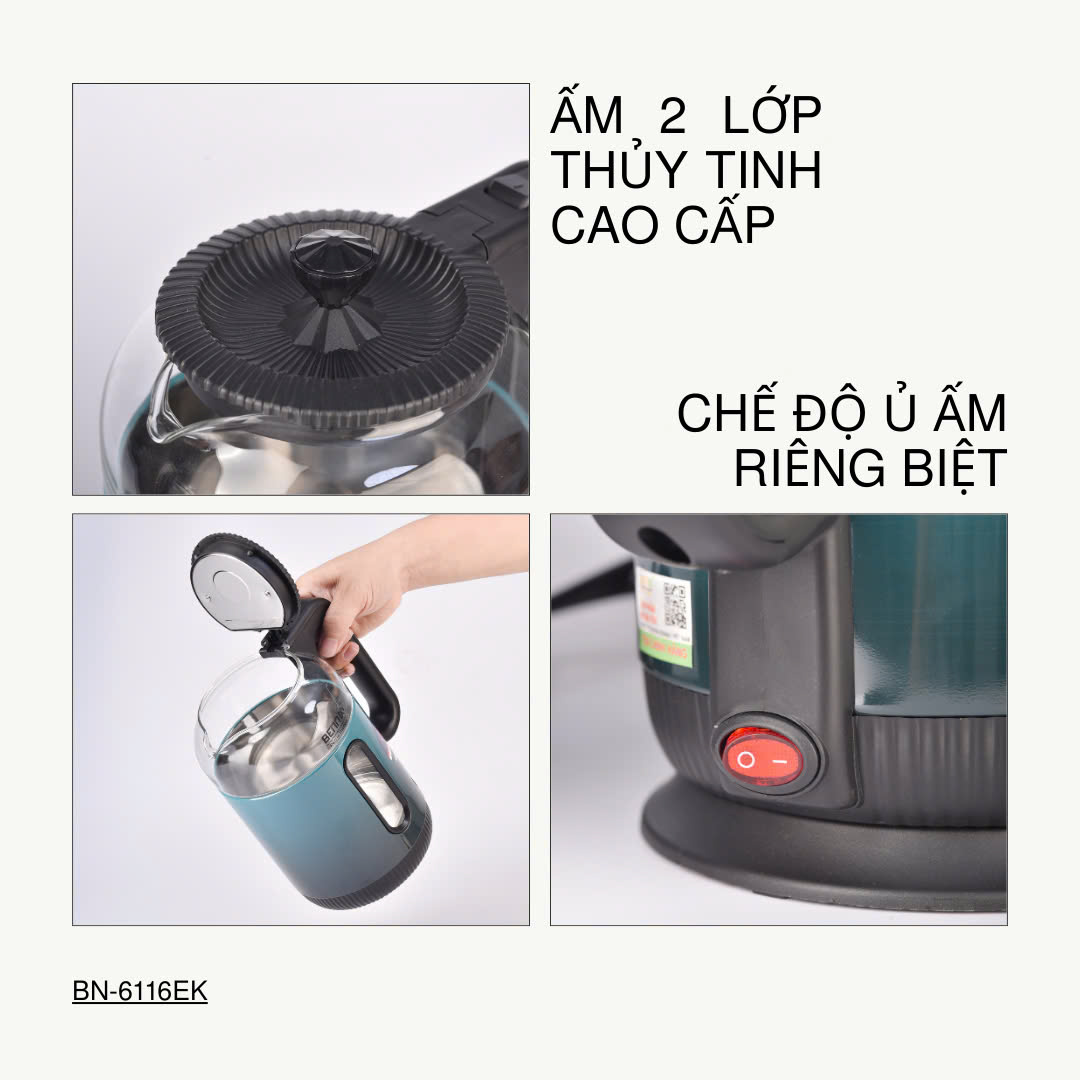 ✨Bình Đun Siêu Tốc Ủ Ấm 2 Lớp Cách Nhiệt Bằng Thuỷ Tinh Bennix BN-6116EK Dung Tích 2L Công Suất 1500W- Hàng Chính Hãng