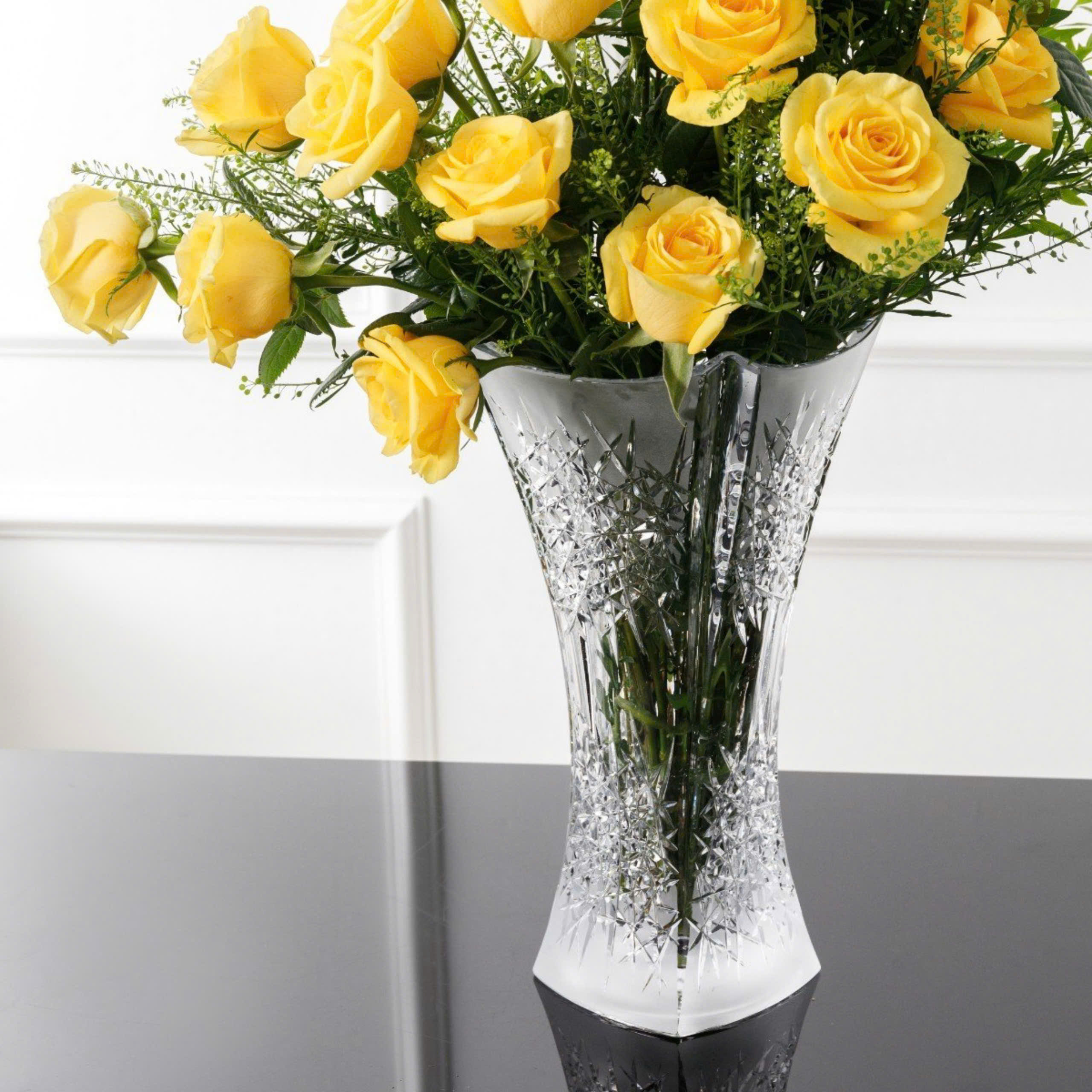 MÔ TẢ: Pha lê cao cấp trong suốt, không bị đục màu theo thời gian sử dụng Bình hoa pha lê cao cấp mài bông tuyết toàn thân bình Họa tiết mài tinh tế, gọn gàng, sắc nét Dáng trụ đứng, miệng tứ giác loe rộng cắm được nhiều loại hoa hoặc dùng trưng bày Thân bình dày dặn: 8mm Kiểu dáng hiện đại, sang trọng