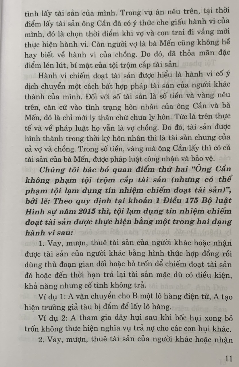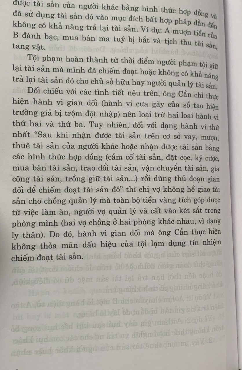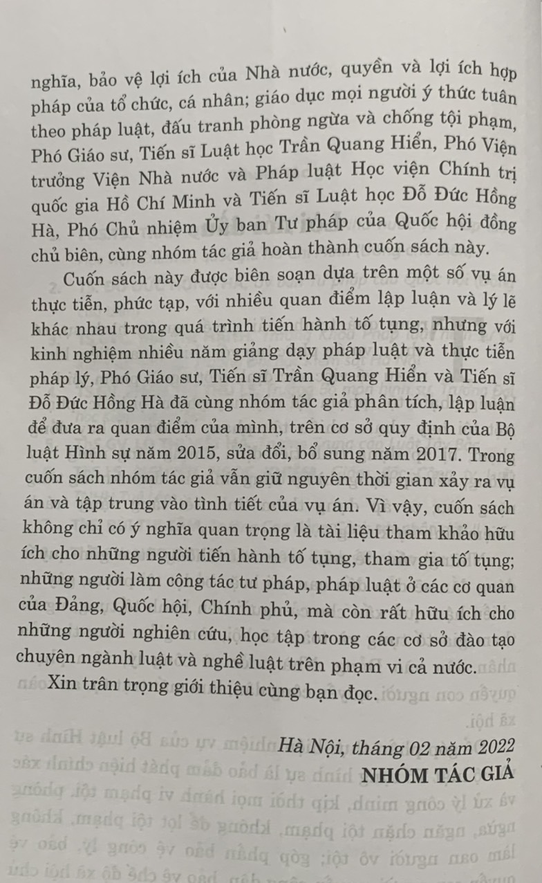 – Cuốn sách này được biên soạn dựa trên một số vụ án thực tiễn, phức tạp, với nhiều quan điểm lập luận và lý lẽ khác nhau trong quá trình tiến hành tố tụng, nhưng với kinh nghiệm nhiều năm giảng dạy pháp luật và thực tiễn pháp lý, Phó Giáo sư, Tiến sĩ Trần Quang Hiển và Tiến sĩ Đỗ Đức Hồng Hà đã cùng nhóm tác giả phân tích, lập luận để đưa ra quan điểm của mình, trên cơ sở quy định của Bộ luật Hình sự năm 2015, sửa đổi, bổ sung năm 2017. Trong cuốn sách nhóm tác giả vẫn giữ nguyên thời gian xảy ra vụ án và tập trung vào tình tiết của vụ án. Vì vậy, cuốn sách không chỉ có ý nghĩa quan trọng là tài liệu tham khảo hữu ích cho những người tiến hành tố tụng, tham gia tố tụng; những người làm công tác tư pháp, pháp luật ở các cơ quan của Đảng, Quốc hội, Chính phủ, mà còn rất hữu ích cho những người nghiên cứu, học tập trong các cơ sở đào tạo chuyên ngành luật và nghề luật trên phạm vi cả nước.