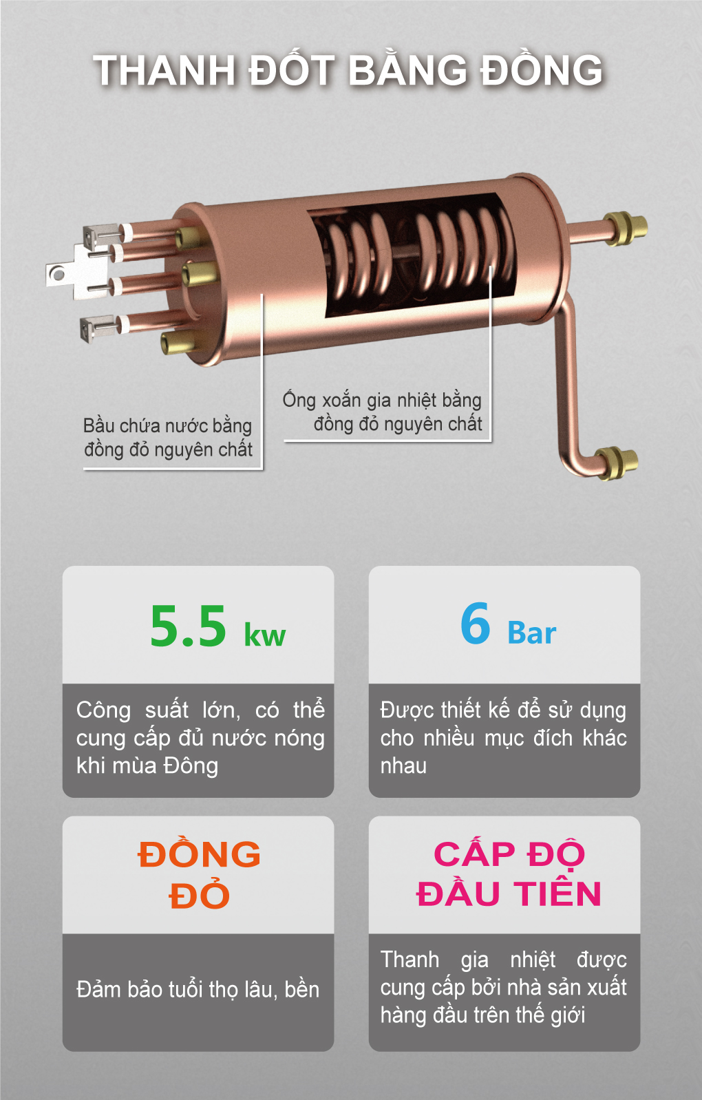 - Bầu đun bằng đồng chịu áp lực cao, trái tim của bình nước nóng. - Không cần bảo trì - Cho nước nóng liên tục theo nhu cầu - Thiết kế nhỏ gọn, lắp