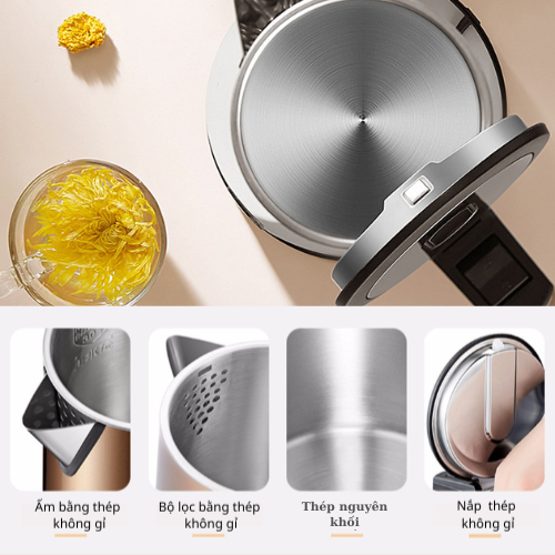 Dung tích: 1.7L  Công suất: 1800W  Ưu điểm nổi bật:  2 lớp cách nhiệt: Thép không gỉ bên trong, nhựa mát tay bên ngoài – an toàn tuyệt đối, nhất là với gia đình có