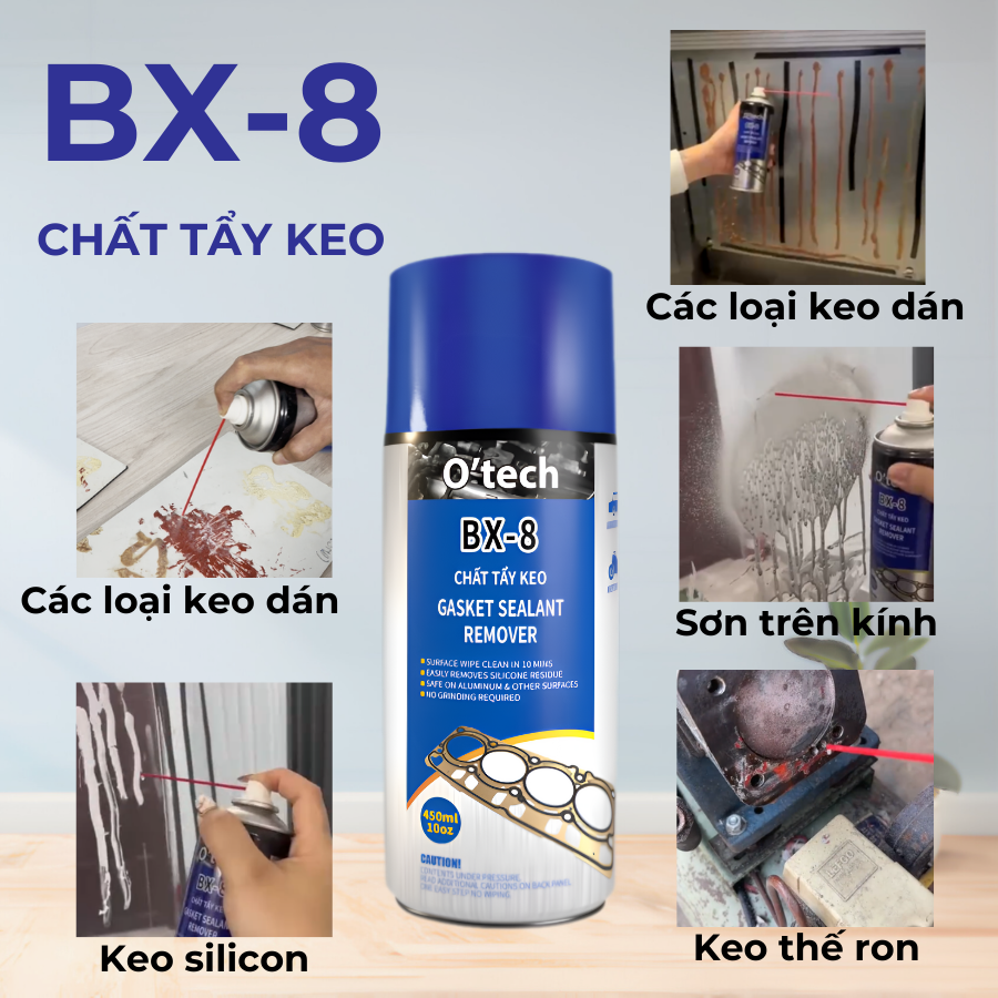 Tên sản phẩm: Chất tẩy keo O’tech BX-8 Gasket Sealant Remover Chất tẩy keo O’tech BX-8 BX-8 Chất tẩy keo tẩy ron là một chất tẩy cực mạnh với công thức được nghiên cứu làm ra để nhanh chóng và dễ dàng loại bỏ phần keo và miếng đệm ron thừa lại – BX-8 bằng cách làm cho vật liệu mềm dẻo đi giúp dễ dàng cạo ra. Nó cũng có thể được sử dụng để loại bỏ các lớp phủ công nghiệp (sơn và vecni), chất kết dính, cặn carbon, dầu đã qua nung và mỡ khỏi bề mặt kim loại. Thành phần chính: Dichloromethane (DCM), Dimethyl Ether (DME), Ethyl Acetate, Hexane, Kerosene. "BX-8 chất tẩy keo, tẩy sơn" là một dung môi hỗn hợp từ 5 loại chất khác nhau, mỗi loại đều mang lại những lợi ích đặc trưng, giúp tạo nên một sản phẩm đa năng và hiệu quả cao trong việc loại bỏ keo và sơn. Dưới đây là một số lợi ích chính khi sử dụng dung môi hỗn hợp này: