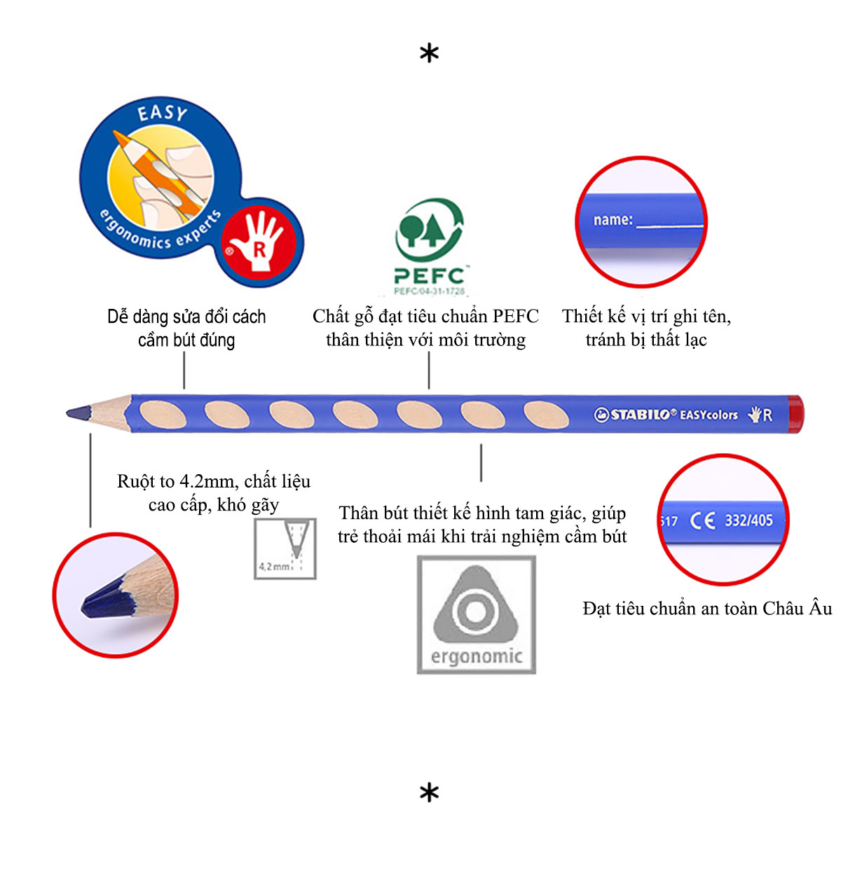 - Bút chì màu hình thể học đầu tiên cho trẻ tập cầm viết đúng cách - Thân tam giác, vị trí cầm khắc sâu trên thân bút - Có khung viết tên, dễ dàng