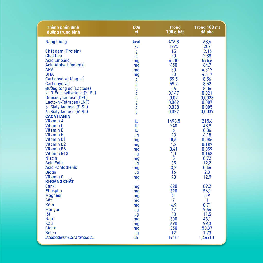 - SỮA tách kem (MILK Skimmed), LACTOSE (Từ SỮA-From MILK), ĐẠM chất lượng OPTIPRO(ĐẠM WHEY, ĐẠM CASEIN từ SỮA-WHEY, CASEIN PROTEIN from MILK), Dầu hướng dương giàu Oleic, Dầu ĐẬU NÀNH (SOYA bean oil), Dầu dừa, Tricalci citrat, Trinatri citrat, Maltodextrin, Dikali hydro phosphat, Chất nhũ hóa Lecithin ĐẬU NÀNH (SOYA lecithin), 2’-Fucosyllactose (2’-FL), Chất nhũ hóa Mono và diglycerid của các acid béo, Natri ascorbat (Vitamin C), Dầu vi tảo biển giàu DHA, Dầu nấm giàu ARA, Lacto-N-Tetraose (LNT), 3'-Sialyllactose (3’-SL), Sắt (II) Sulphat, Difucosyllactose (DFL), 6'-Sialyllactose (6’-SL), Kẽm sulfat, DL-alpha-tocopheryl acetat (Vitamin E), Hương liệu tự nhiên vanillin, Nicotinamid, Chất điều chỉnh độ acid Acid citric, Bifidobacterium lactis (Bifidus BL), D-pantothenat calci (Vitamin B5), Chất chống oxy hóa Ascorbyl palmitat, Đồng sulfat, Retinyl acetat (Vitamin A), Thiamin mononitrat (Vitamin B1), Pyridoxin hydroclorid (Vitamin B6), Riboflavin (Vitamin B2), Chất chống oxy hóa Tocopherol concentrat (dạng hỗn hợp), Mangan sulfat, Axit folic, Kali iodid, Phytomenadion (Vitamin K1), Natri selenat, D-biotin (Vitamin B7), Cholecalciferol (Vitamin D3), Cyanocobalamin (Vitamin B12). () có chứa LACTOSE (contain LACTOSE) Đặc điểm nổi bật