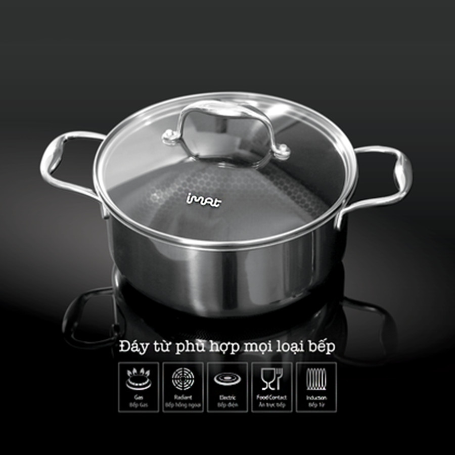 Vung nồi bằng thuỷ tinh chịu nhiệt, trong suốt nên dễ quan sát thực phẩm trong khi nấu. Logo iMat in sắc nét trên vung và đáy nồi.