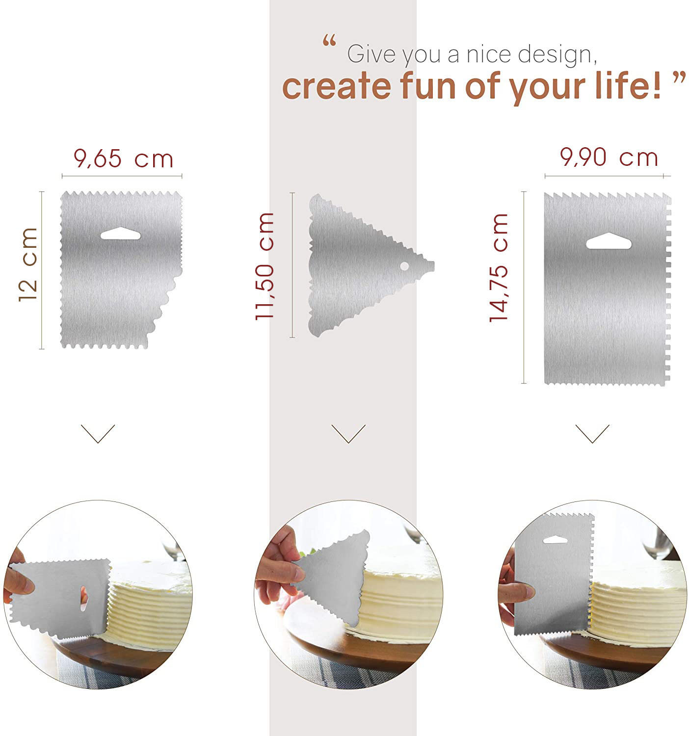 Được làm bằng thép không gỉ, bền đẹp, dể dàng vệ sinh - Các cạnh của dao với nhiều hoa văn dể dàng tạo ra những mẫu bánh viền kem khác nhau.