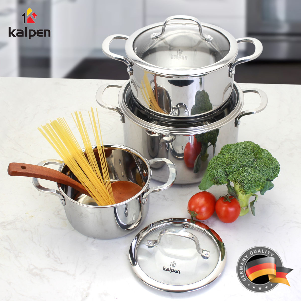 Bộ 3 nồi Inox 3 lớp liền khối Kalpen Kazler KZ1 size 16,20,24cm chuẩn Đức Mã sản phẩm: KZ1 Thương hiệu: Kalpen xuất xứ Đức Dòng sản phẩm: Kazler Chất liệu: vung kính cường lực dầy