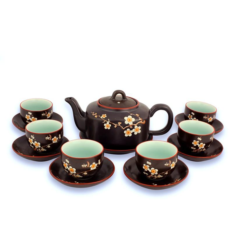 - Xuất sứ: Bát Tràng - Chất liệu: Đất nung cao nhiệt , hoa văn vẽ mai bằng tay tỉ mỉ từng đường nét - Sản phẩm bao gồm: 01 ấm quai đồng, 06 chén,