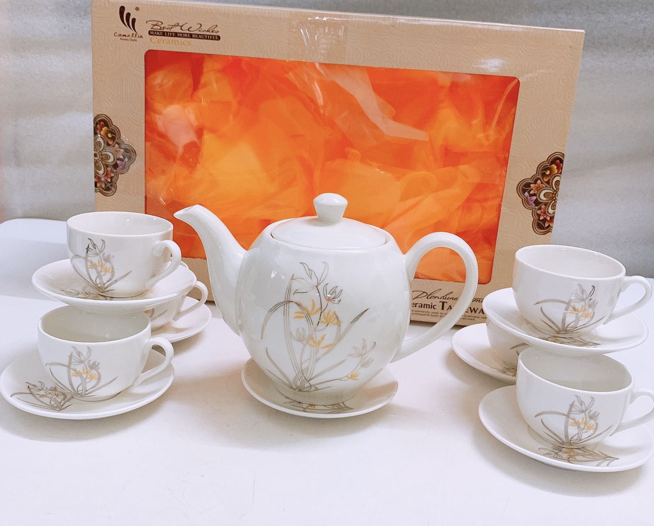 ✨Bộ ấm chén pha trà kèm 7 đĩa sứ camelia màu trắng hoa bạc - ANTH464