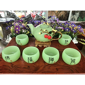 ✨Bộ ấm trà chạm cây táo với ly chạm chữ đá ngọc cẩm thạch xanh