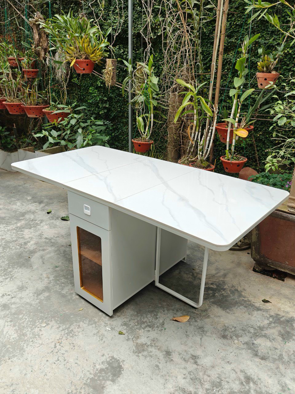 Bàn ăn thông minh gấp gọn tiện dụng giá tại xưởng ! Kích thước cụ thể: Khi mở rộng : Dài 1600 x Rộng 850 x Cao 750 Khi gấp gọn : Dài 850 x Rộng 4̉60 x Cao 750 Chất liệu Bàn : Thân gỗ MDF Thái chống ẩm. Chân thép tĩnh điện. Mặt đá CERAMIC chống xước chống ố.