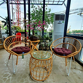 Mua tại TiktokBộ sản phẩm gồm : 01 bàn kính + 02 ghế kèm 02 nệm như hình màu sắc như hình Tính thẩm mỹ được khẳng định rõ nét trong không gian ngôi nhà của bạn. Bạn được tận dụng cảm giác giãn thật sự mỗi khi cùng nhau nghỉ ngơi sau những giờ làm việc căng thẳng Ghế ngoài trời cao cấp là giải pháp lý tưởng về cách thức trang trí sân vườn, cảnh quan sống hiện đại. Hãy để Navicom đồng hành cùng bạn trong quá trình kiến tạo không gian sống sang trọng, tiện nghi và thoải mái nhất. Chất liệu Khung Sắt + mây PE+ Gối vải Gối vải màu sắc ngẫu nhiên Kích thước ghế: 700 x 700 x 800 mm Kích thước bàn: 550 x 550 x 420mm Chất liệu: Sắt đặc sơn tĩnh điện, dây vinyl nguyên sinh Tạo cảm giác êm ái, sảng khoái cho người sử dụng