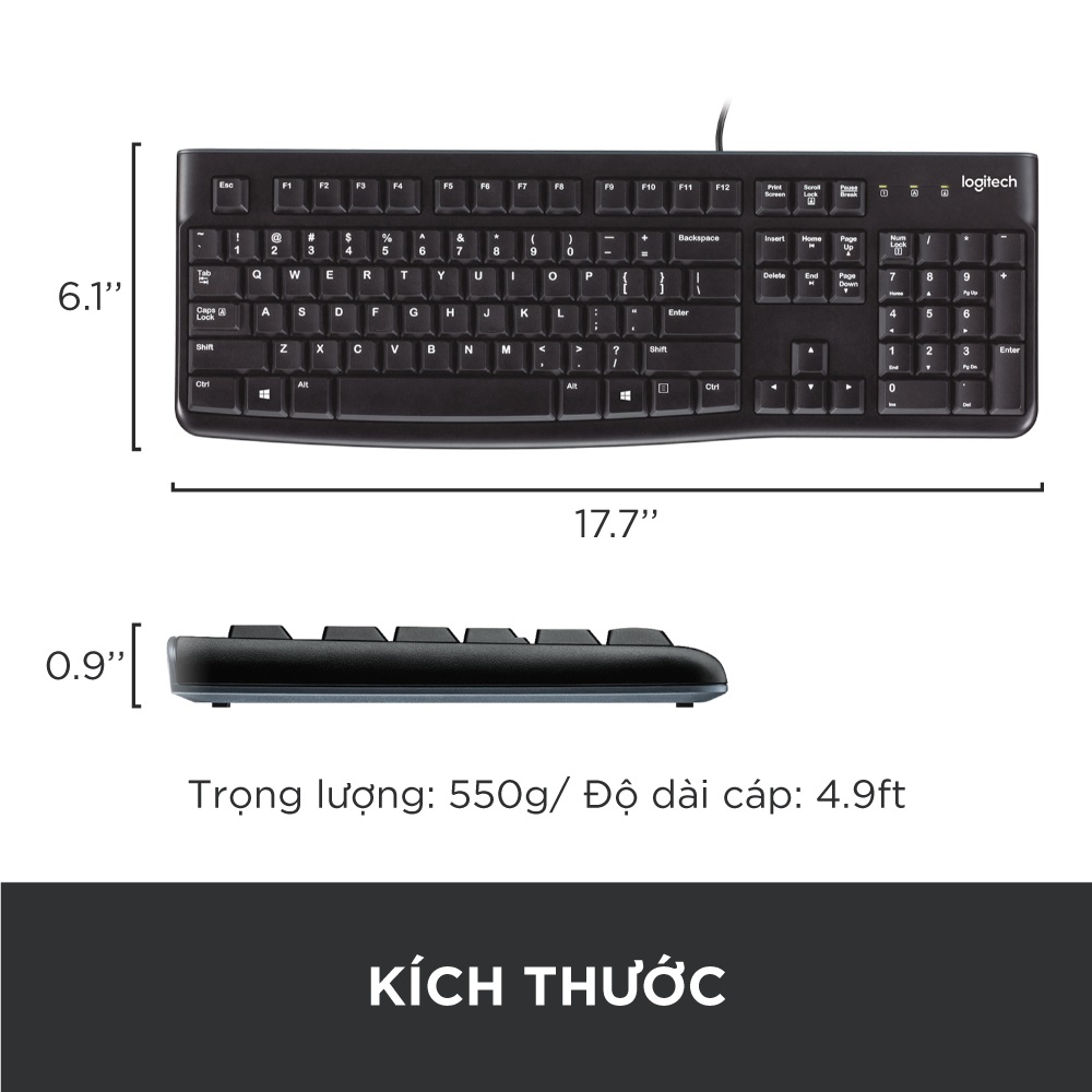 Mua tại TiktokBỘ ĐÔI CHUỘT VÀ BÀN PHÍM MÁY TÍNH CÓ DÂY MK120(Chuột Logitech B100 và phím logitech K120) THÔNG SỐ KỸ THUẬT BÀN PHÍM K120 Logitech Thiết kế chống nước đổ tràn 4Được kiểm nghiệm trong điều kiện giới hạn (tối đa 60 ml chất lỏng đổ tràn). Không được nhúng bàn phím vào chất lỏng. Độ cao bàn phím có thể điều chỉnh Bàn phím số 10 phím Đèn báo khóa chữ hoa (Caps lock) Đèn báo khóa số (Num lock ) Lên tới 10 triệu lần nhấn phím (trừ phím khóa số) Loại phím: Cấu hình sâu Chiều cao: 155 mm Chiều rộng: 450 mm Chiều dày: 23,5 mm Trọng lượng: 550 g Chiều dày: Tăng độ sáng phím CHUỘT B100 Logitech Công nghệ cảm biến: Theo dõi quang học Số lượng nút: 3 (Nhấp trái/phải, Nhấp chuột giữa) Cuộn: từng dòng Bánh xe cuộn: Có, quang học Chiều cao: 113 mm Chiều rộng: 62 mm Chiều dày: 38 mm Trọng lượng: 90 g Chiều dày: 180 cm MÔ TẢ CHI TIẾT ĐƠN GIẢN, ĐÁNG TIN CẬY Hoàn thành công việc phải là hoạt động đơn giản. Đó là điều khiến cho Bộ đôi MK120 trở thành công cụ phù hợp hoàn hảo. Con chuột và bàn phím có kích thước đầy đủ đem đến thiết kế quen thuộc, dễ sử dụng, hoạt động ngay khi lấy ra khỏi hộp. Chỉ cần cắm bộ đôi có dây này qua USB là sử dụng được. BÀN PHÍM CÓ KÍCH THƯỚC ĐẦY ĐỦ Bàn phím có kích thước đầy đủ kèm bàn phím số tích hợp này giúp cho việc nhập dữ liệu, tính toán và điều hướng diễn ra nhanh chóng. Phím cách uốn cong cùng với các phím dễ đọc đem đến trải nghiệm gõ thoải mái và quen thuộc. THOẢI MÁI CHO CẢ HAI TAY Con chuột cân xứng, có kích thước đầy đủ đem lại khả năng theo dõi mượt mà và hình dạng uốn cong để nâng đỡ lòng bàn tay, giúp điều hướng dễ dàng và thoải mái. CẮM VÀO LÀ SỬ DỤNG DỄ DÀNG Cả bàn phím và chuột đều hoạt động ngay khi lấy ra khỏi hộp. Chỉ cần cắm vào cổng USB là chúng đã sẵn sàng hoạt động. Không cần tải về, không cần thiết lập, không phức tạp. BÀN PHÍM CHỐNG NƯỚC ĐỔ TRÀN Thiết kế chống đổ tràn1Được kiểm nghiệm trong điều kiện giới hạn (tối đa 60 ml chất lỏng đổ tràn). Không được nhúng bàn phím vào chất lỏng., các phím bền bỉ và chân nghiêng vững chắc có chiều cao có thể điều chỉnh, bàn phím này được chế tạo để sử dụng được trong thời gian dài. MỀM DẺO VÀ BỀN BỈ Với bảo hành 2 năm đi kèm, MK120 được chế tạo với cùng tiêu chuẩn chất lượng cao đã giúp Logitech trở thành nhà dẫn đầu toàn cầu về chuột và bàn phím Địa chỉ bảo hành: Thông qua tiki hoặc tại - Nhà nhập khẩu- Công ty cổ phần máy tính Vĩnh Xuân: số 9 ngõ 117 Thái Hà, Hà Nội