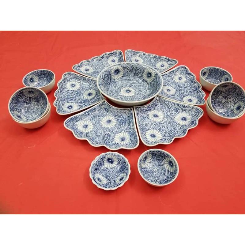 Trọn bộ bát đĩa hoa mặt trời men kem hoa sen xanh gốm sứ Bát Tràng có gì?