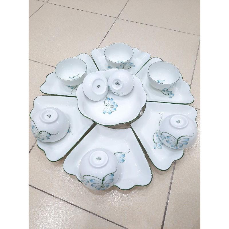 BỘ BÁT ĐĨA HOA MẶT TRỜI SEN XANH 18 CHI TIẾT - TRỌN BỘ gồm : - 1 Bộ 6 cánh đĩa + bát tô tạo hình bông hoa , đk cả bộ 45cm rất