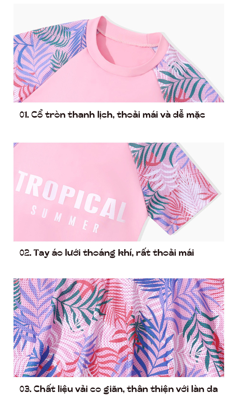- Mẫu đồ bơi mới nhất cho các bạn nữ thích sự trẻ trung kín đáo mà vẫn thu hút khi đi biển, đi bơi. - Áo dáng ngắn tay phối hoạ tiết trẻ khoẻ,