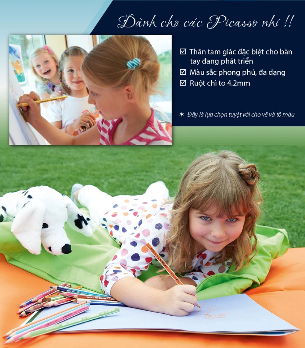- Bút chì màu thân tam giác, dễ cầm - Ruột to 4.2mm (>50% so với chì màu thường) - Tô nhanh, khó gẫy, màu tươi - Xuất sứ: Séc