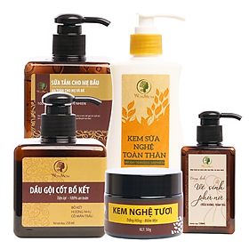Bộ sản phẩm bao gồm: 1 Kem nghệ tươi 50 gram + 1 Kem sữa nghệ body 150 gram + 1 Sữa tắm hữu cơ 250 ml + 1 Dầu gội cốt bồ kết 250 ml + 1 Dung dịch vệ sinh phụ nữ 150 ml