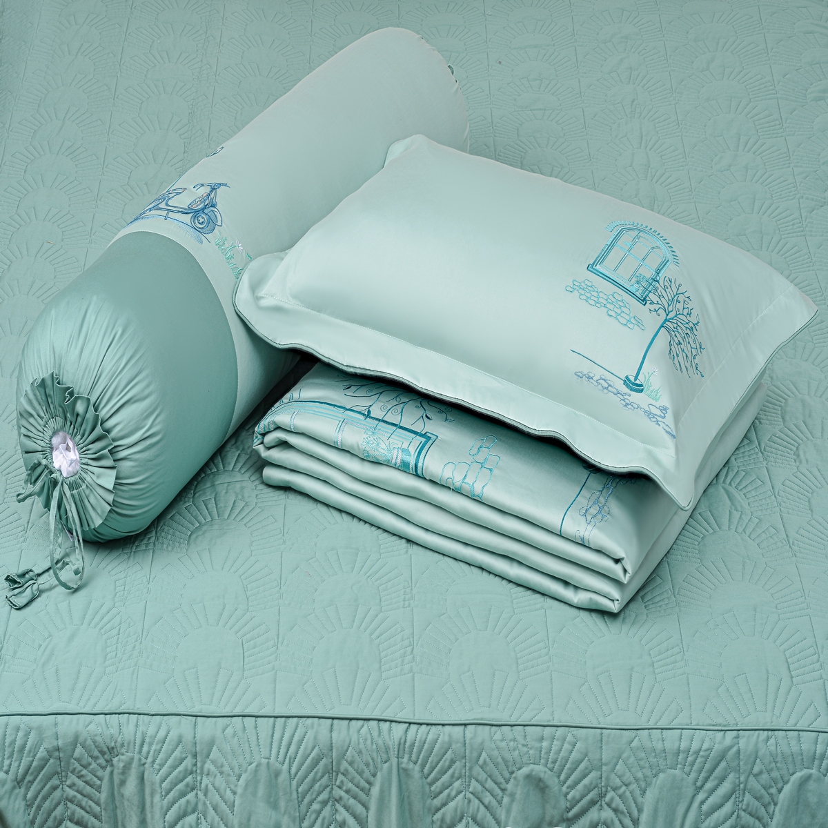 BỘ CHĂN DRAP GỐI TENCEL GỒM 5 MÓN: - 2 Vỏ gối nằm 50X70cm + 1 vỏ gối ôm 35x100cm • 1 ga {bọc nệm dưới 25 cm} - 1 mền chần gòn 1m8x2m2 Lưu