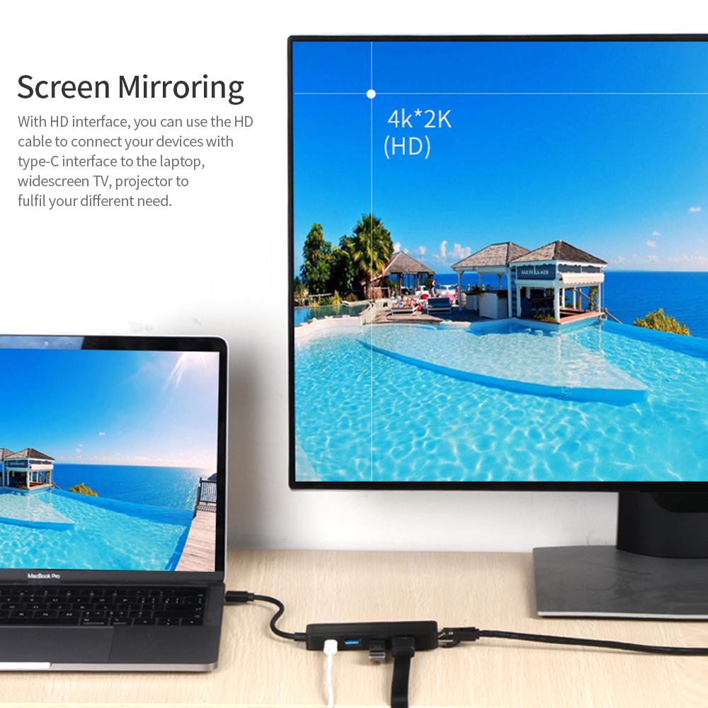 Feature: Smoother Surfing Experience. With RJ45 interface, you can connect with 1000Mbps Ethernet network cable to smooth your working, gaming and downloading. The RJ45 interface supports network speed: 10/100/1000Mbps. Screen Mirroring. With HD interface, you can use the HD cable to connect your devices with USB interface to the laptop, widescreen TV, projector to fulfil your different need. And the HD interface supports resolution up to 4K 30Hz. Besides, there are two modes for choices, with the mirroring mode enabling you to mirror your minor screen to a major one while the extending one enabling you to use two devices at the same time. High-speed Transmission. With USB 3.0, you can enjoy the high speed of transmission, which shortens the time of transmitting large files. Convenient to Use. With type-C interface, you can charge your devices while playing. Besides, the type-C supports PD3.0 protocol which can provides fast charge for your devices. Excellent Watching Experience. The HD interface supports synchronizing video and audio output, which makes it a wonderful choice for watching movies, live matches, sports events, etc. Specification: Input: Type-C male Output: 1 HD, 2 USB 3.0, 1 RJ45, 1 Type-C Resolution: 4K30Hz Material: Aluminium alloy Color: Grey Package size: 15 8 2.3cm/ 5.91 3.15 0.91in Package weight: 71g/ 2.5oz Packing list: 1 Type-C to HD Ethernet USB Adapter 1 User manual