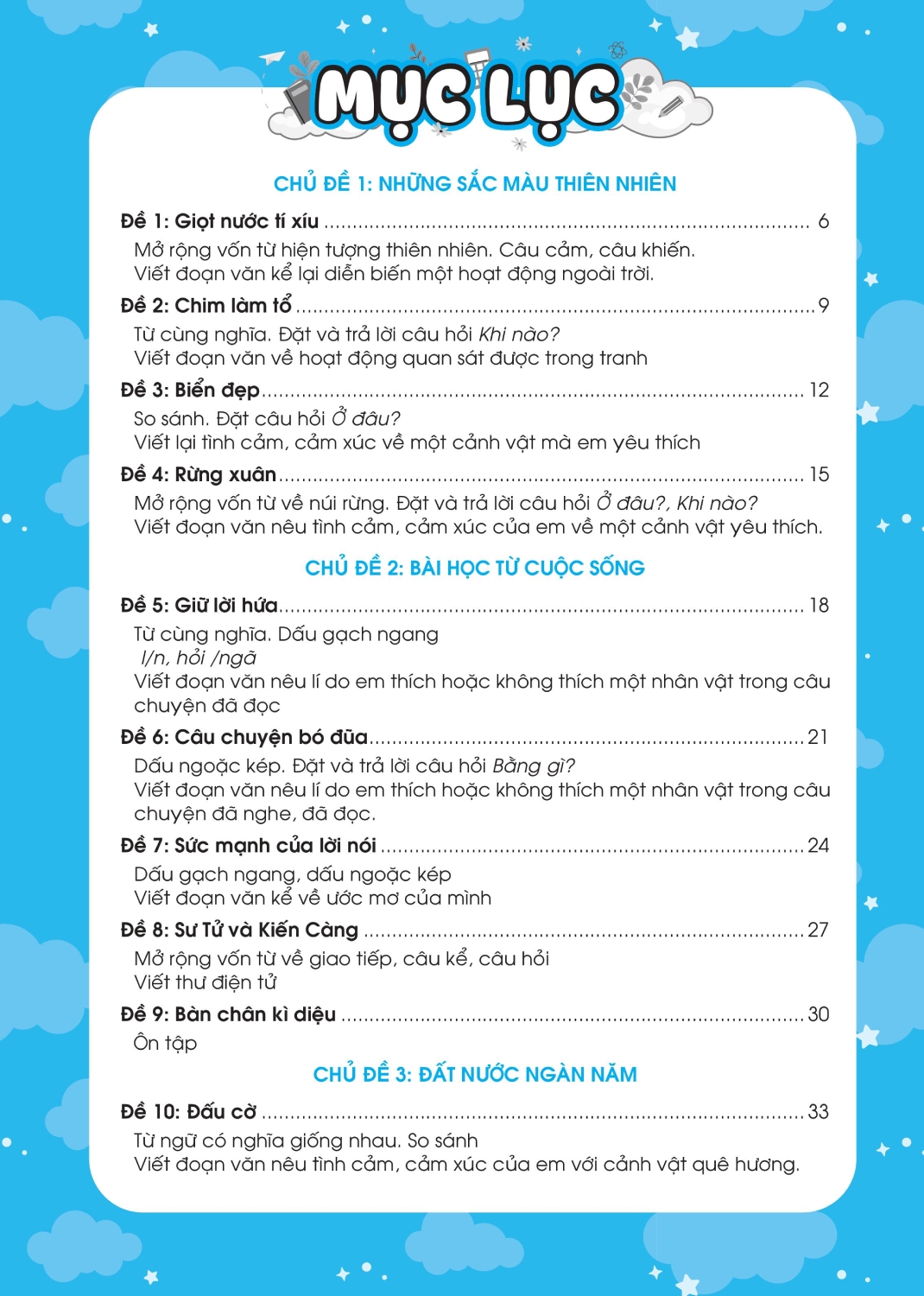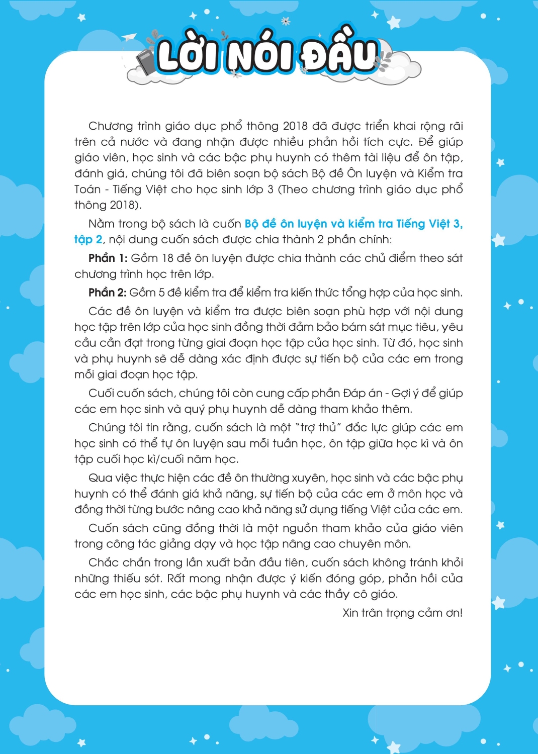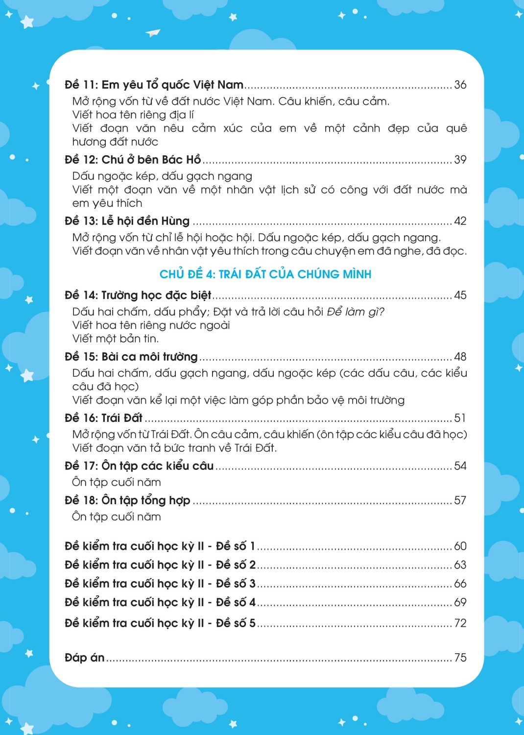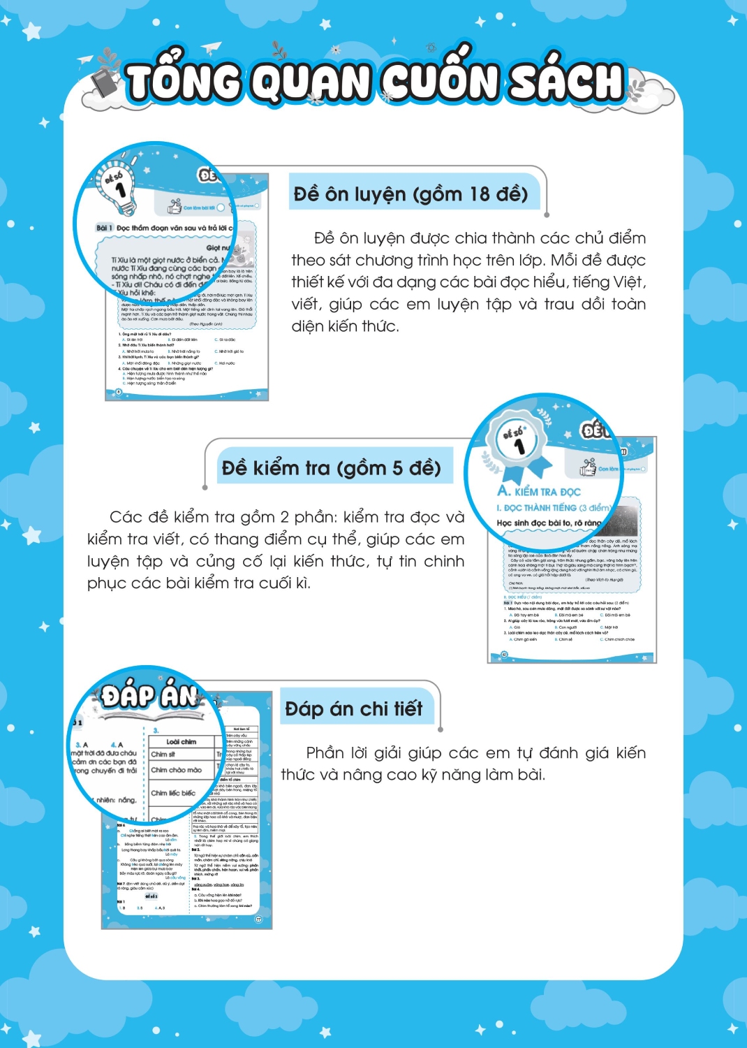 - Sách được chia thành 2 phần rất dễ hiểu cho các bé: Phần đề ôn tập và Phần đề kiểm tra. Phần đề ôn tập: Gồm 18 đề được chia theo các chủ điểm, hoặc chia thành các đề ôn tập theo sát chương trình học trên lớp theo giai đoạn. Phần đề kiểm tra: Gồm 5 đề kiểm tra cuối học kỳ để kiểm tra, đánh giá kiến thức tổng hợp của học sinh.