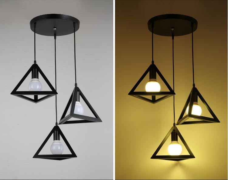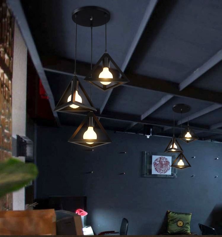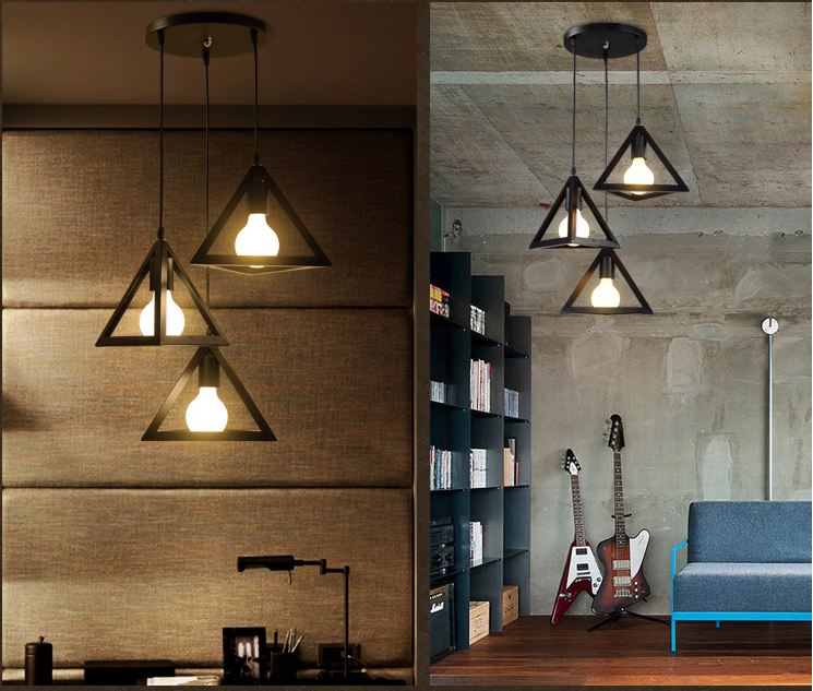 Bộ 3 đèn thả khối tam giác trang trí cao cấp kèm bóng LED và đế ốp trần Đường kính đèn 25 cm. Làm bằng khung sắt sơn tĩnh điện. Phù hợp cho trang trí quán cafe,
