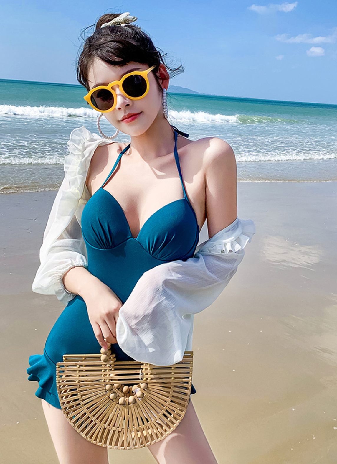 - Đơn giản nhưng vẫn cực kì nổi bật nhờ đường cong ôm sát, cách điệu với lớp bèo vừa che vai, vừa tôn vòng một các nàng ạ. - Bikini mặc đi biển làm