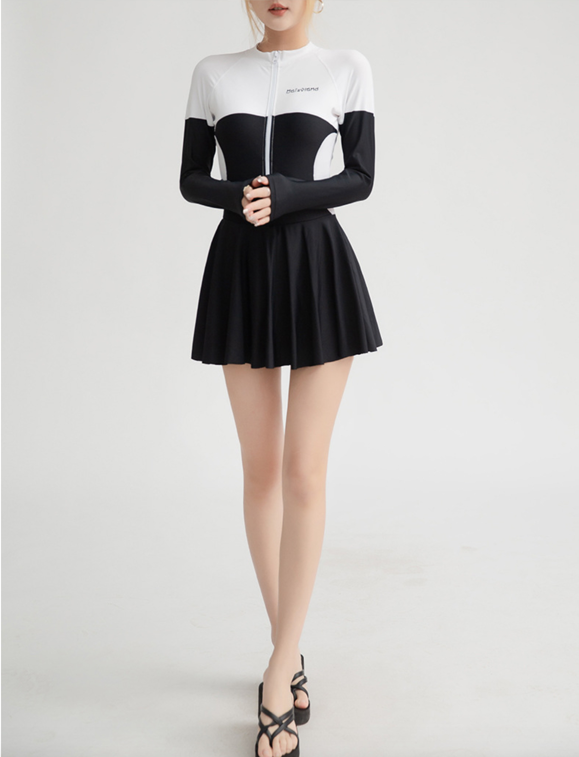 - Mẫu đồ bơi áo tắm dành cho các bạn gái thích dáng kín đáo nhưng vẫn trẻ trung, năng động. - Dáng quần short (đùi) thể thao, áo thun cộc tay kèm khoá kéo