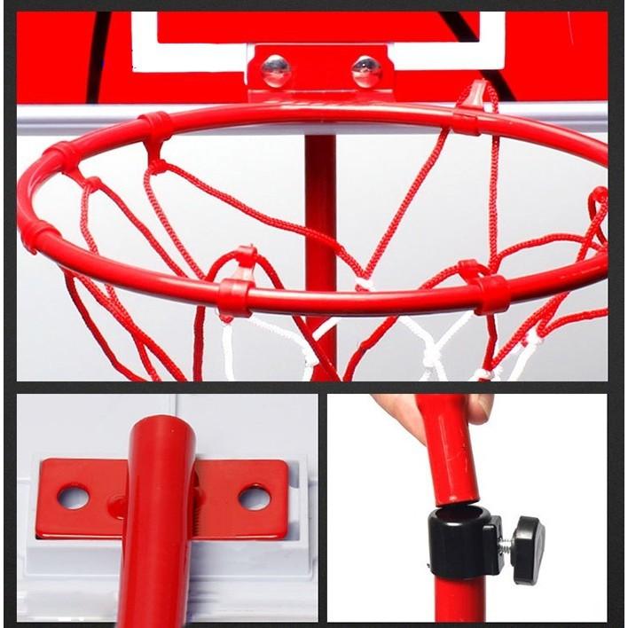 Bộ đồ chơi bóng rổ trụ sắt được làm từ Chất liệu an toàn và đảm bảo chất lượng nghiêm ngặt Bộ đồ chơi bóng rổ có thân Trụ làm bằng sắt rất chắc chắn, giúp phát triển toàn diện về thể chất & chiều cao cho bé. Giúp hình thành cho bé sở thích chơi thể thao từ nhỏ. Tháo lắp khá dễ dàng, phù hợp với không gian trong nhà và ngoài trời Chân đế bộ bóng rổ được làm từ nhựa ABS chịu lực cực tốt, thân Bộ Bóng rổ được làm từ thép chống gỉ, có ren bắt vít – sản phẩm an toàn cho mọi lứa tuổi. Đồ Chơi Bóng rổ cho bé có Kèm 1 Trái bóng lớn (đường kính 17 cm) và 1 Trái bóng nhỏ (đường kính 13 cm) Đường kính trong của rổ đựng bóng rổ là 19 cm Kích thước bảng rổ 34 x 25 cm