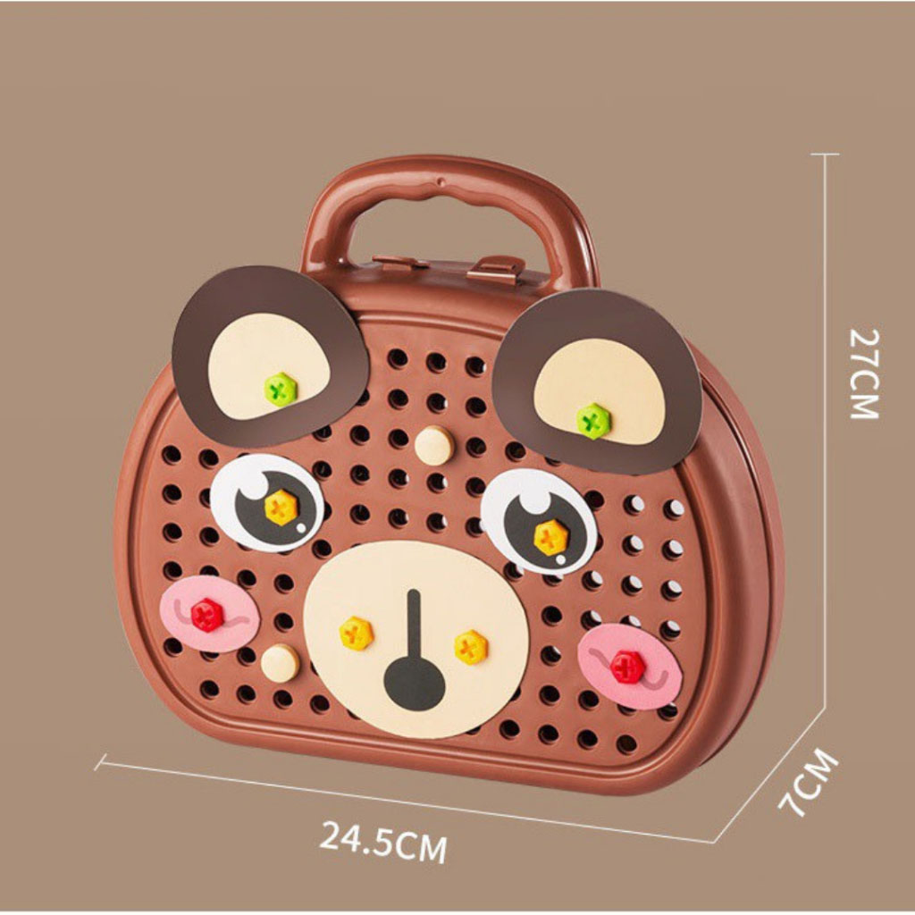 - 1 va li bằng nhựa hình gấu màu vàng đựng các chi tiết được đục lỗ để gắn ốc kích thước 27x24,5x7cm + 1 khoan chạy pin siêu xịn xò