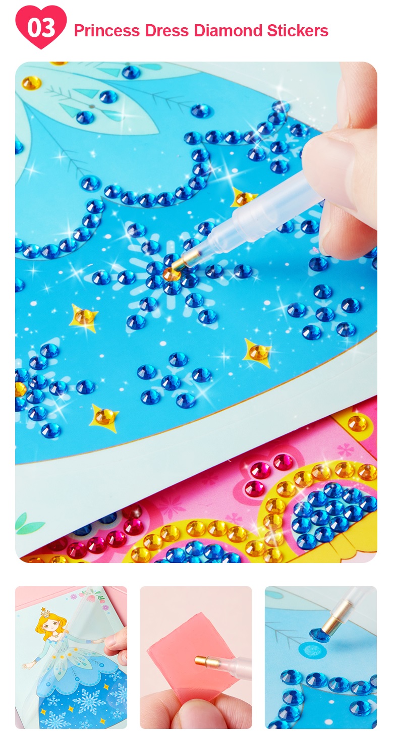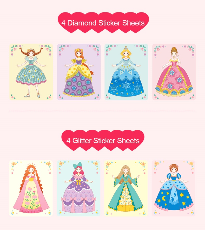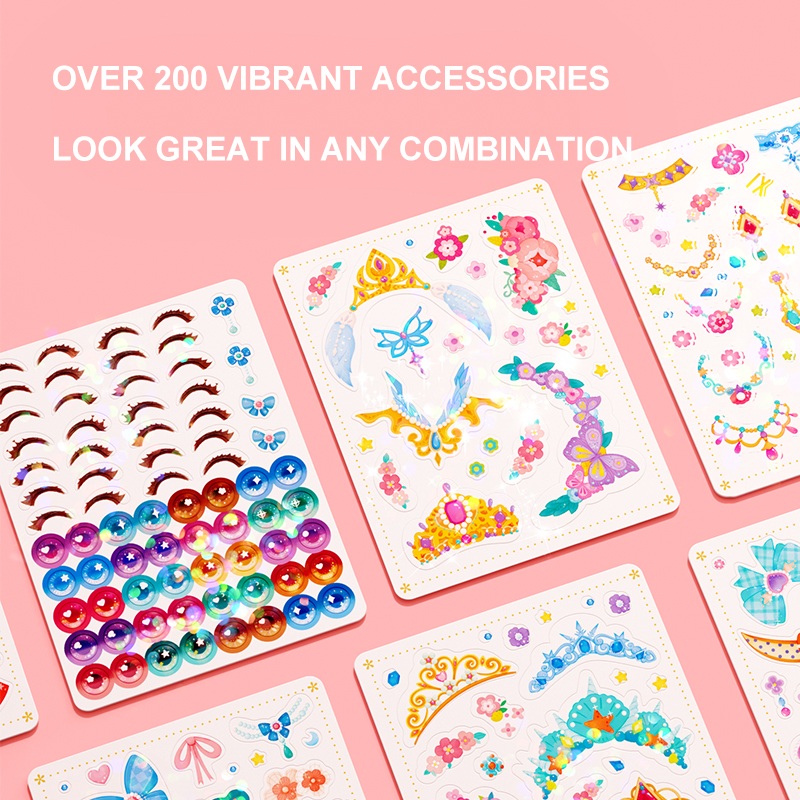 Bộ trang điểm Mideer bao gồm: 20 mẫu trang điểm công chúa, 4 mẫu nhãn dán kim cương, 4 mẫu nhãn dán sáng bóng, 4 nhãn dán, 6 màu, 900 viên kim cương, 10 chất liệu vải, 1 tấm, 1 bút đính cương, 1 keo dán, 2 cọ trang điểm