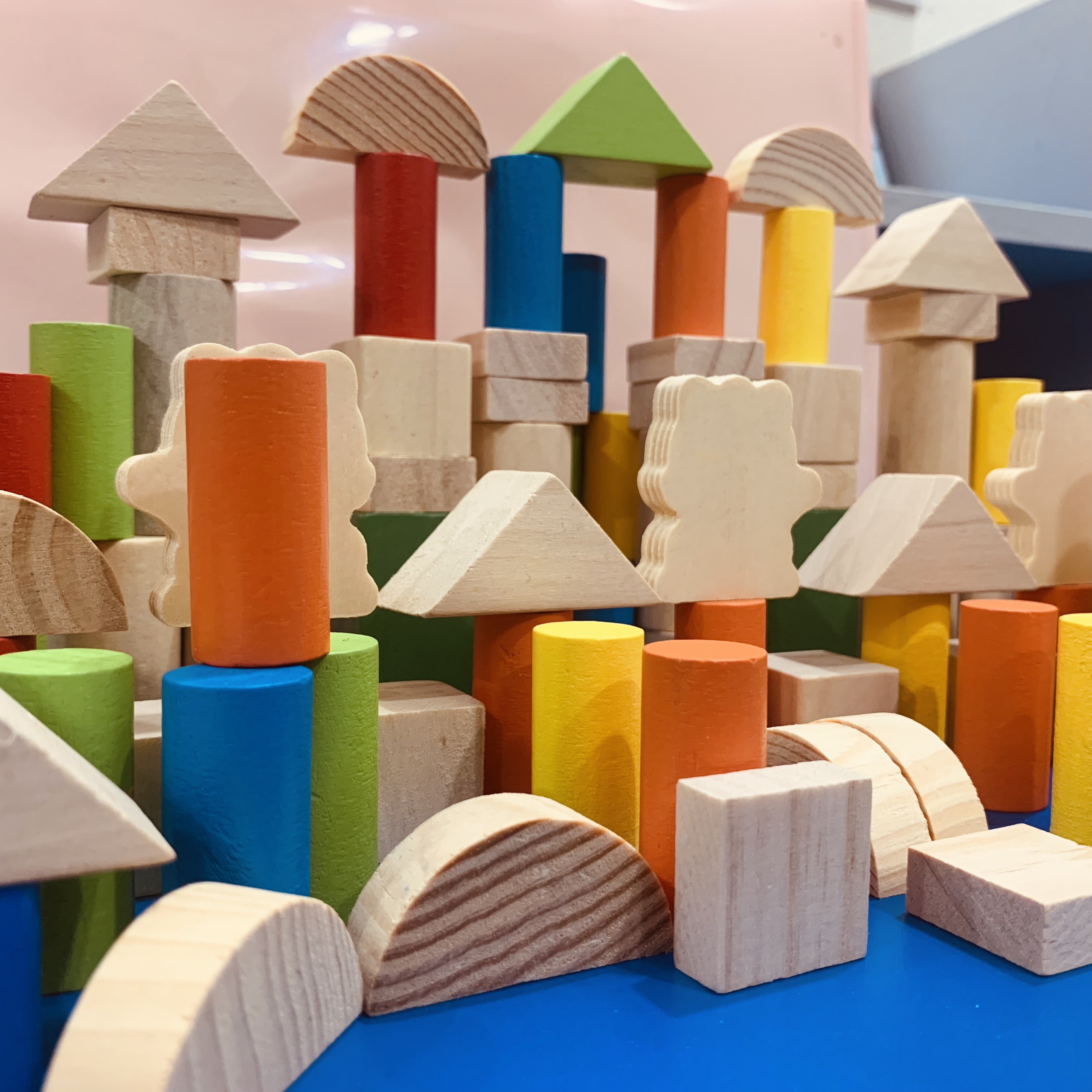 Giới Thiệu - Xếp hình bằng gỗ 100 chi tiết miếng ghép gỗ có nhiều dạng hình khối khác nhau như khối vuông, khối hộp chữ nhât, tam giác, hình trụ nhiều màu sắc sặc