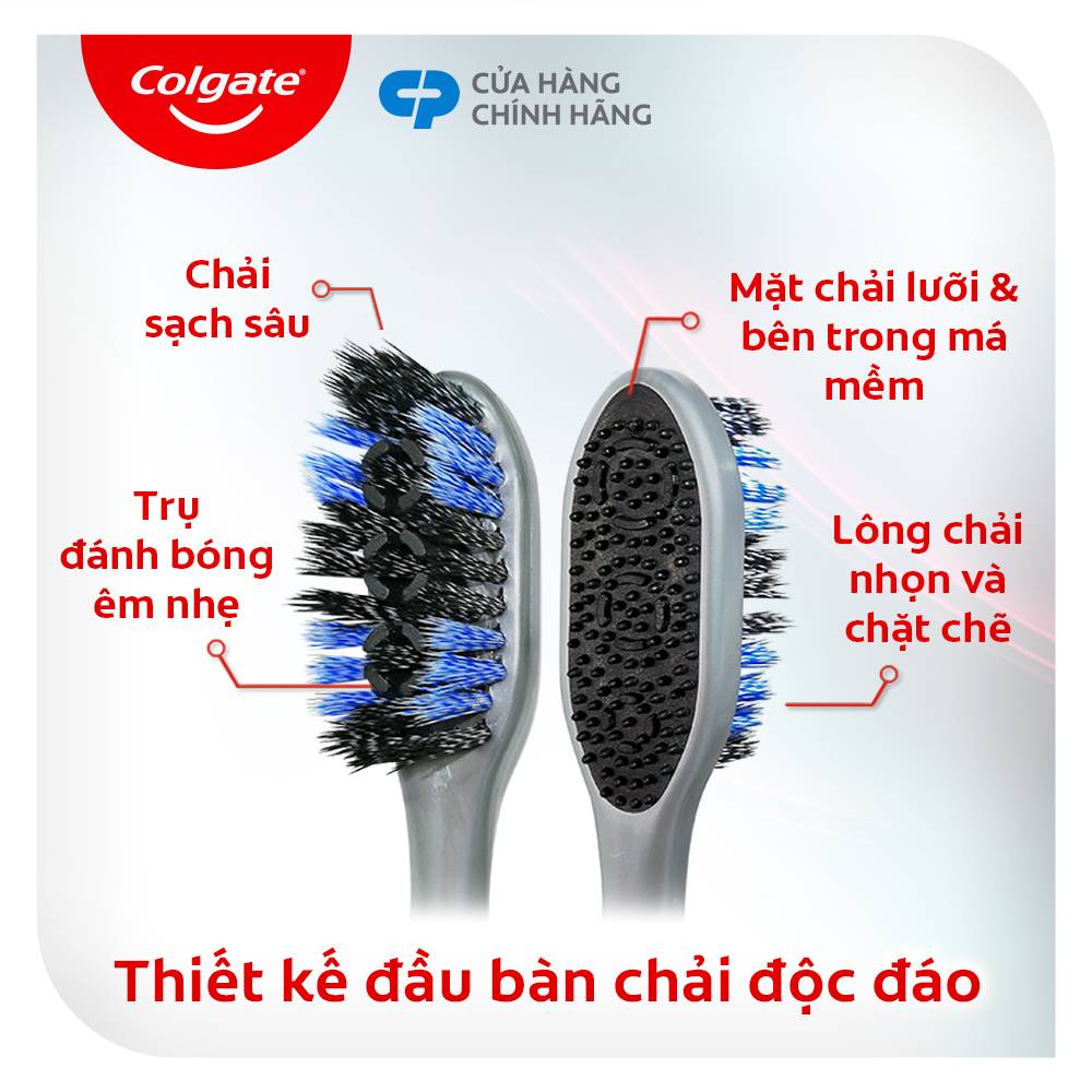 - Sự kết hợp giữa lông chải xoắn kép màu xanh với lông chải đen phủ than giúp đánh tan mảng bám, loại bỏ vết ố trên răng