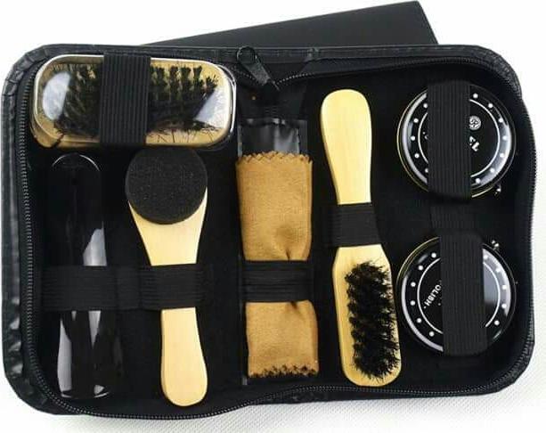 Bộ dụng cụ đánh giày 7 món kèm xi tiện lợi – Gồm đủ bộ si, cọ, nước lau giầy….xi đánh giày tiện lợi. Nhuộm và giữ màu làm sáng bóng giày dép – Bộ
